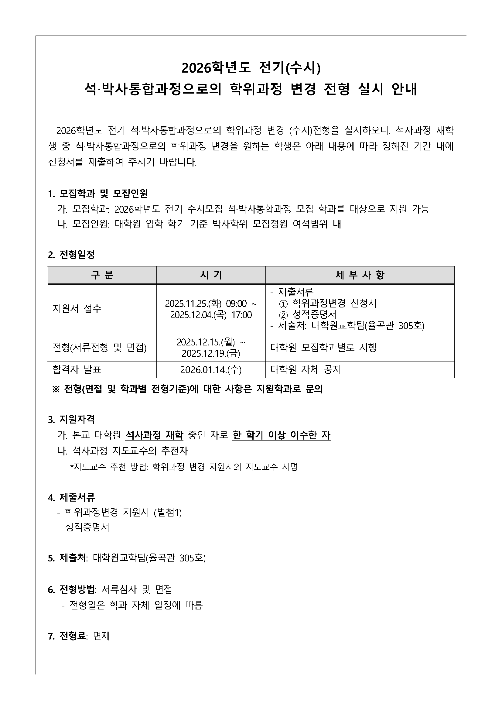 [공지] 2026학년도 전기(수시) 석‧박사통합과정으로의 학위과정 변경 전형 실시 안내