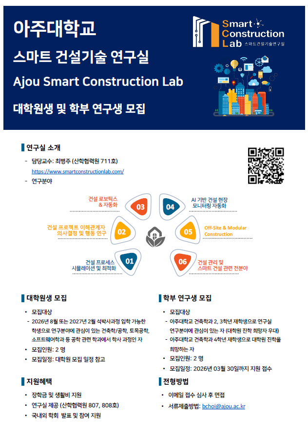 [학사] [건축학과] 스마트건설기술 연구실 대학원생 및 학부 연구생 모집 공고
