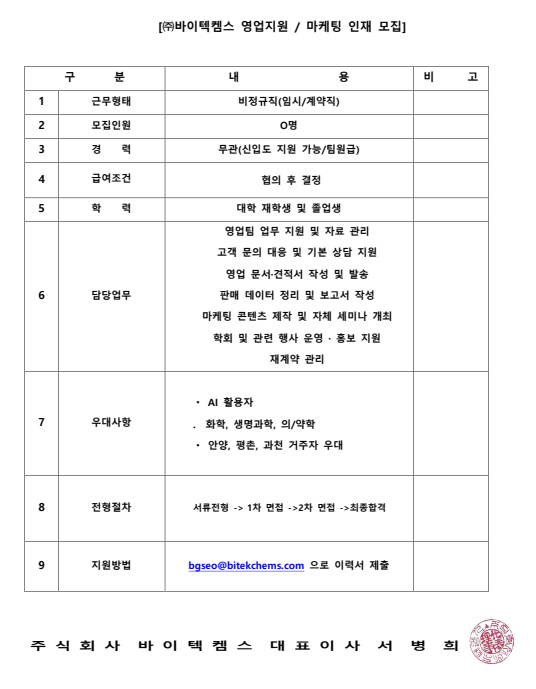 [졸업] ㈜바이텍켐스 직원 모집