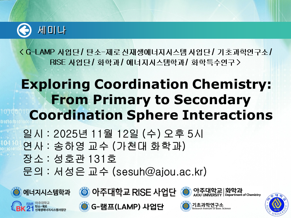 [2025.11.12.(수)] < G-LAMP 사업단 / 탄소-제로 신재생에너지시스템 사업단 / 기초과학연구소 / RISE 사업단 / 화학과 / 에너지시스템학과 / 화학특수연구 > 세미나 안내