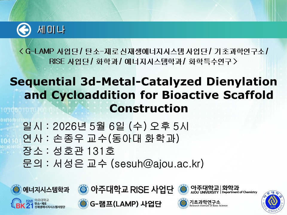 [공지] [2026.05.06.(수)] < G-LAMP 사업단 / 탄소-제로 신재생에너지시스템 사업단 / 기초과학연구소 / RISE 사업단 / 화학과 / 에너지시스템학과 / 화학특수연구 > 세미나 안내