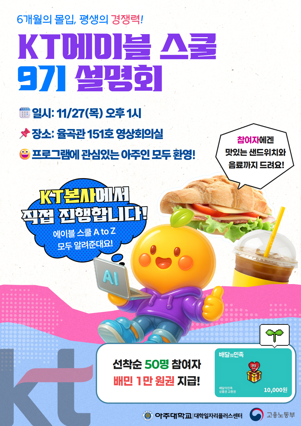 [행사] [일자리+센터]🎁선착순 배민 1만원권 + 샌드위치 음료! ✨KT본사가 직접 진행하는 <KT에이블 스쿨 9기 설명회>