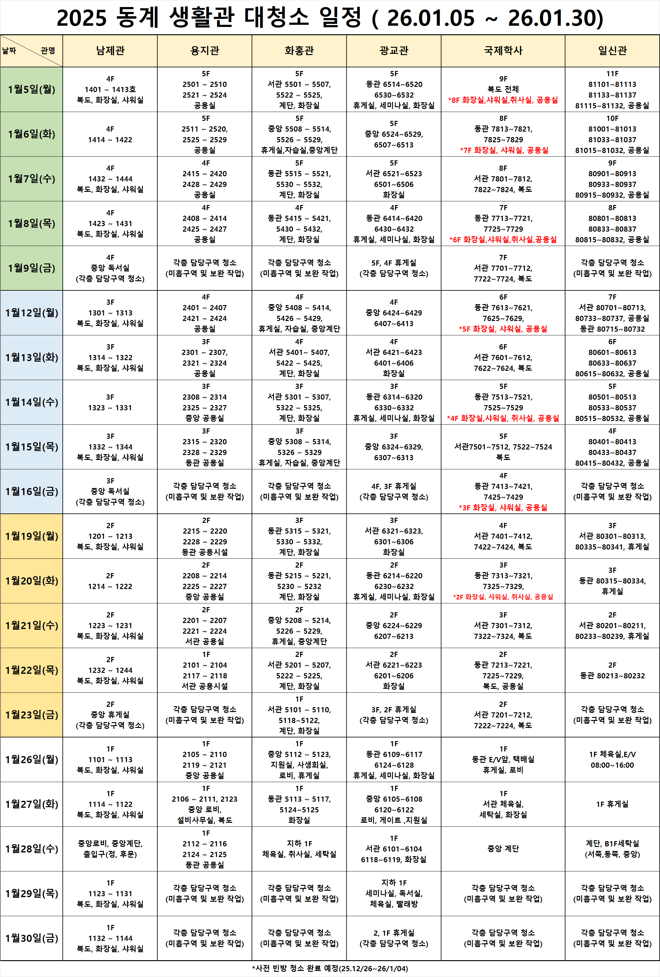 2025-동계방학 생활관 대청소 일정을 아래와 같이 안내 드리오니 사생 여러분의 협조 부탁드립니다.