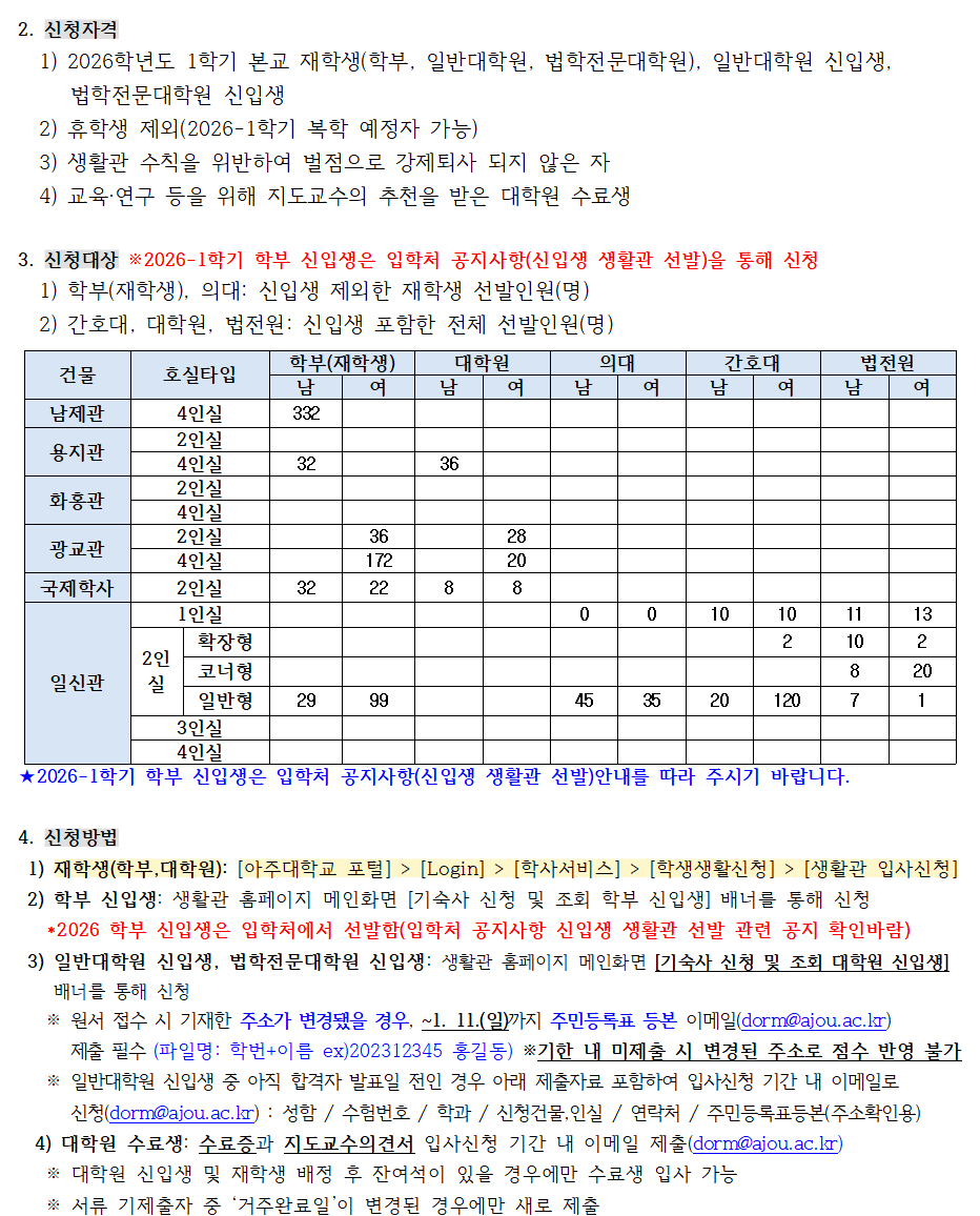 [공지] 2026학년도 1학기 생활관 입사신청 안내 (선발인원 추가 25.01.02)