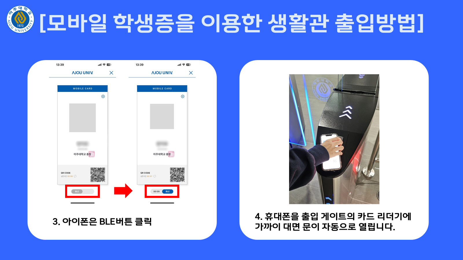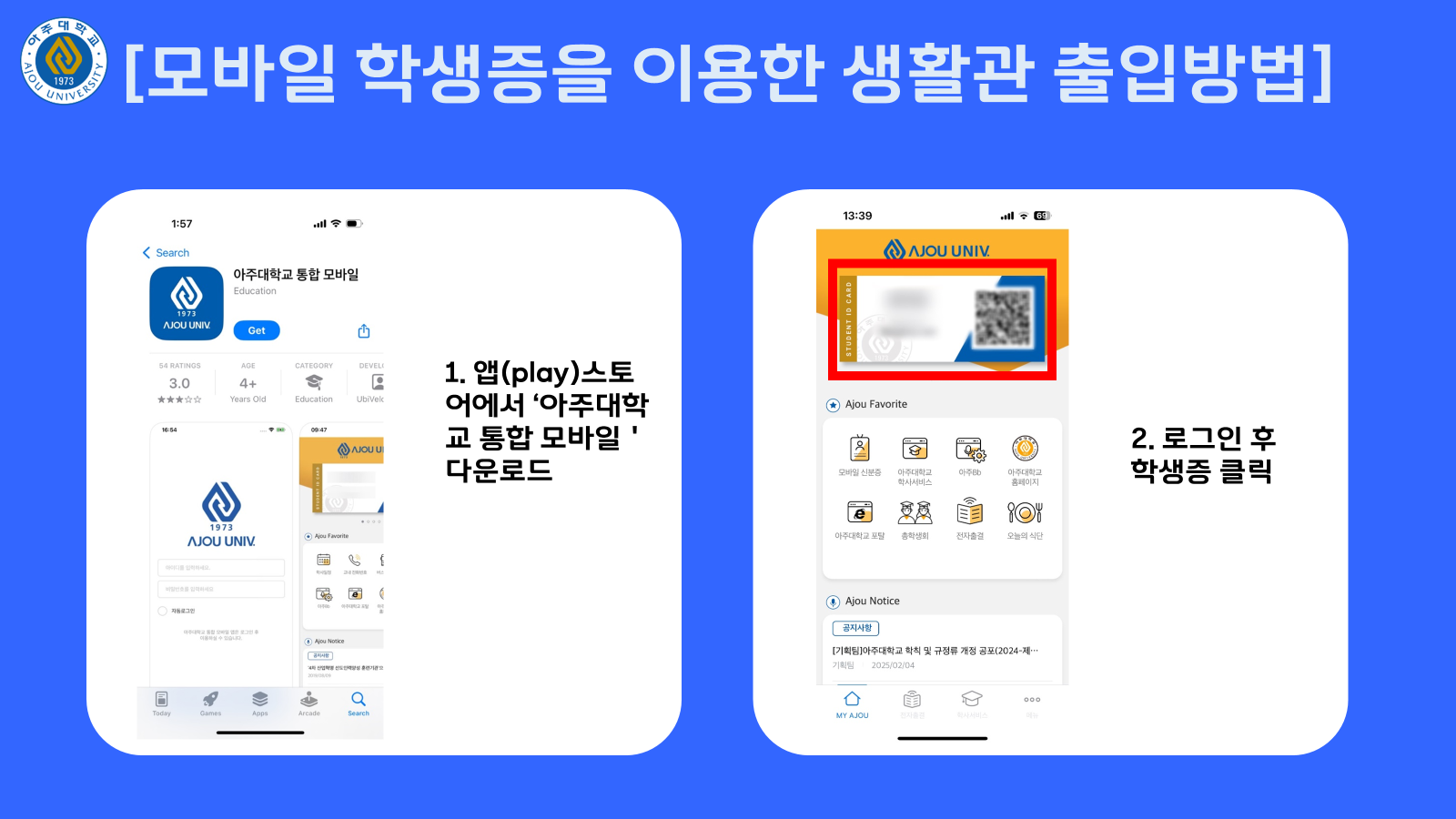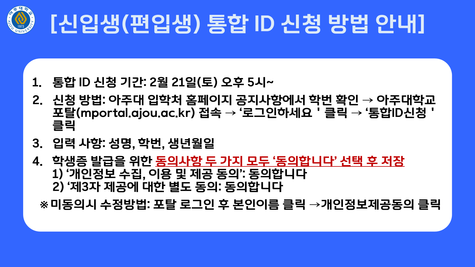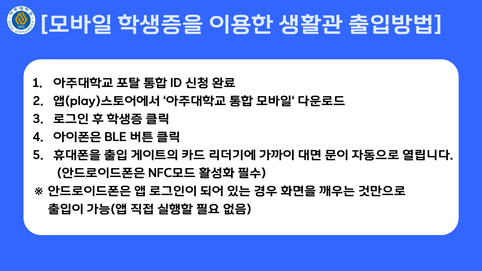 - 입사 전 반드시 미리 아주대학교 포탈에서 통합ID신청(▼하단의 안내문 참고) 후 모바일 학생증 발급하여 배정된 건물의 1층 지원실에 방문하여 입사확인서 작성 후 호실로 이동