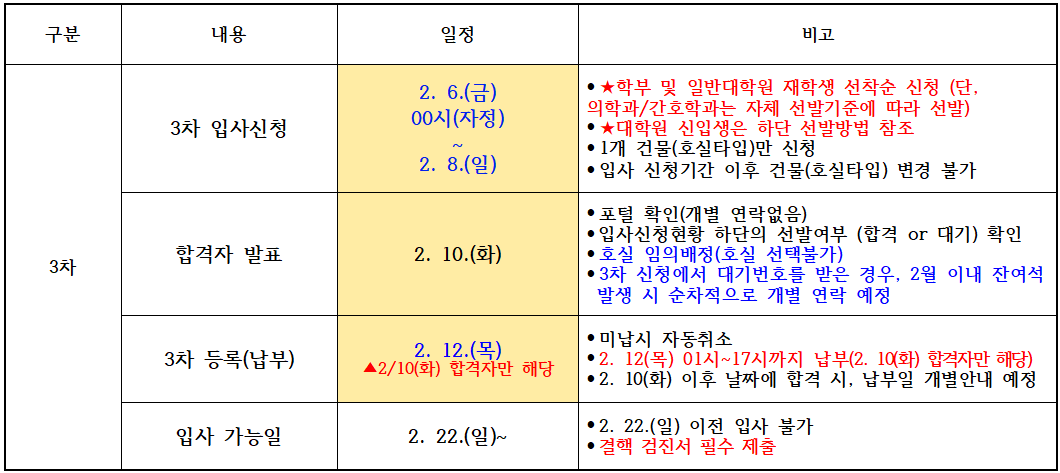 3) 잔여석에 한하여 3차 신청자를 선발하며, 잔여석이 없는 건물/호실타입의 경우 선발되지 않을 수 있음