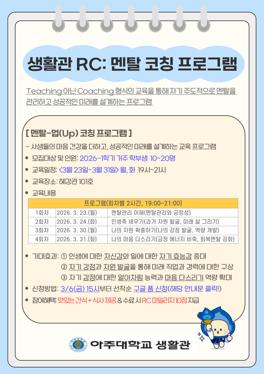 2026학년도 1학기에 사생 여러분의 마음 건강과 성공적인 미래 설계를 돕는 생활관 RC 멘탈-업 코칭 프로그램이 진행됩니다. 유익한 교육 프로그램과 함께 맛있는 간식 + 식사😋도 함께 제공되오니 많은 관심과 참여 바랍니다.