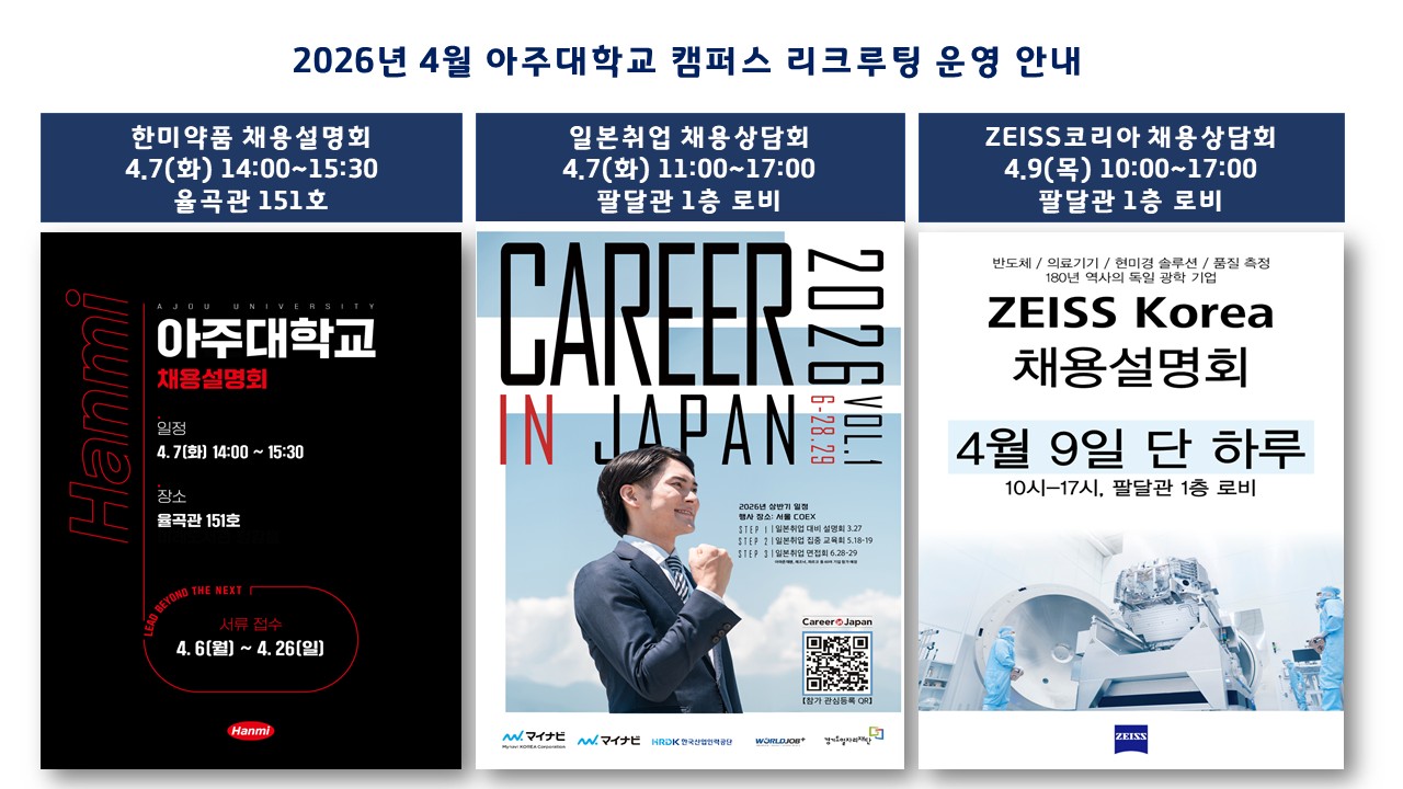 - 매년 Career In Japan에 아주대 재학생들의 지원이 많아(이공/상경 모두) 상담회를 통해 참여시 준비에 대한 정보등 제공 예정