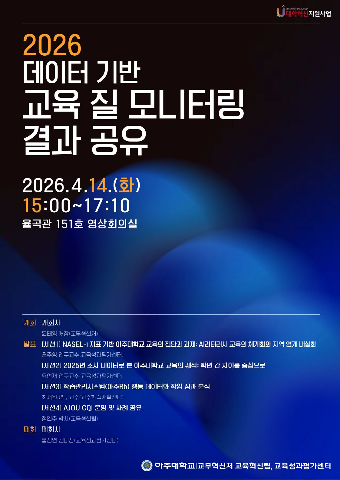 「2026년 데이터 기반 교육 질 모니터링 결과 공유 포럼」 행사를 아래와 같이 개최하오니 구성원 여러분의 많은 관심과 참가 부탁드립니다.