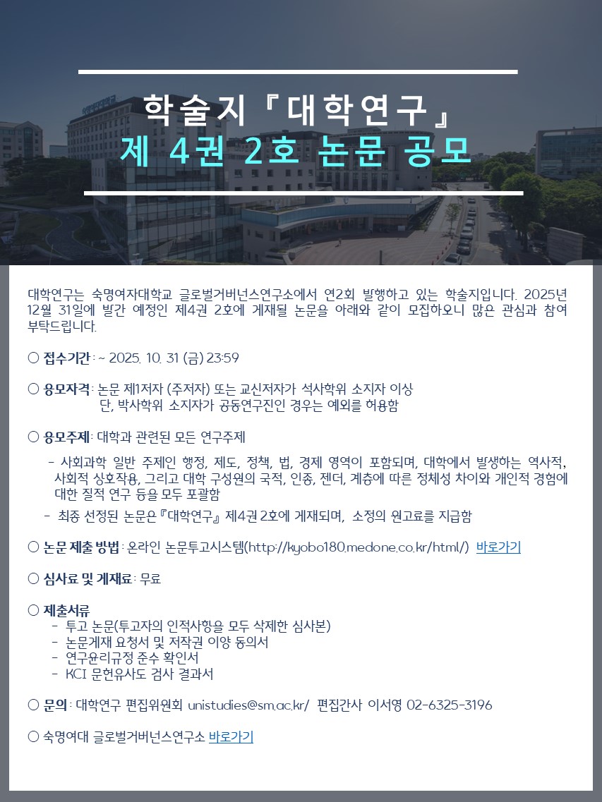 숙명여대 글로벌거버넌스연구소 『대학연구』제4권 2호 논문 공모 안내