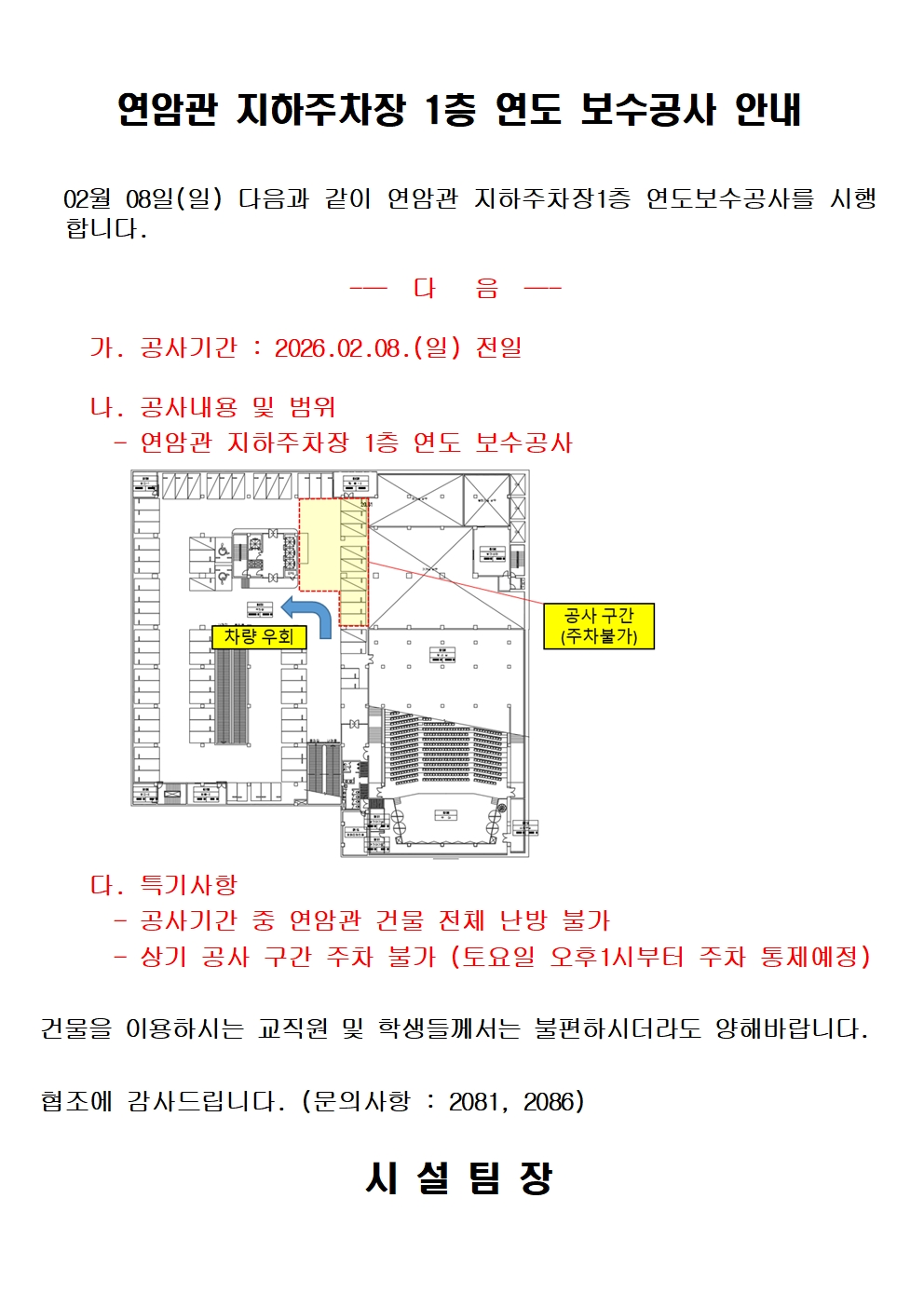 [공지] 연암관 지하주차장 1층 연도 보수공사 안내 (2.8.)