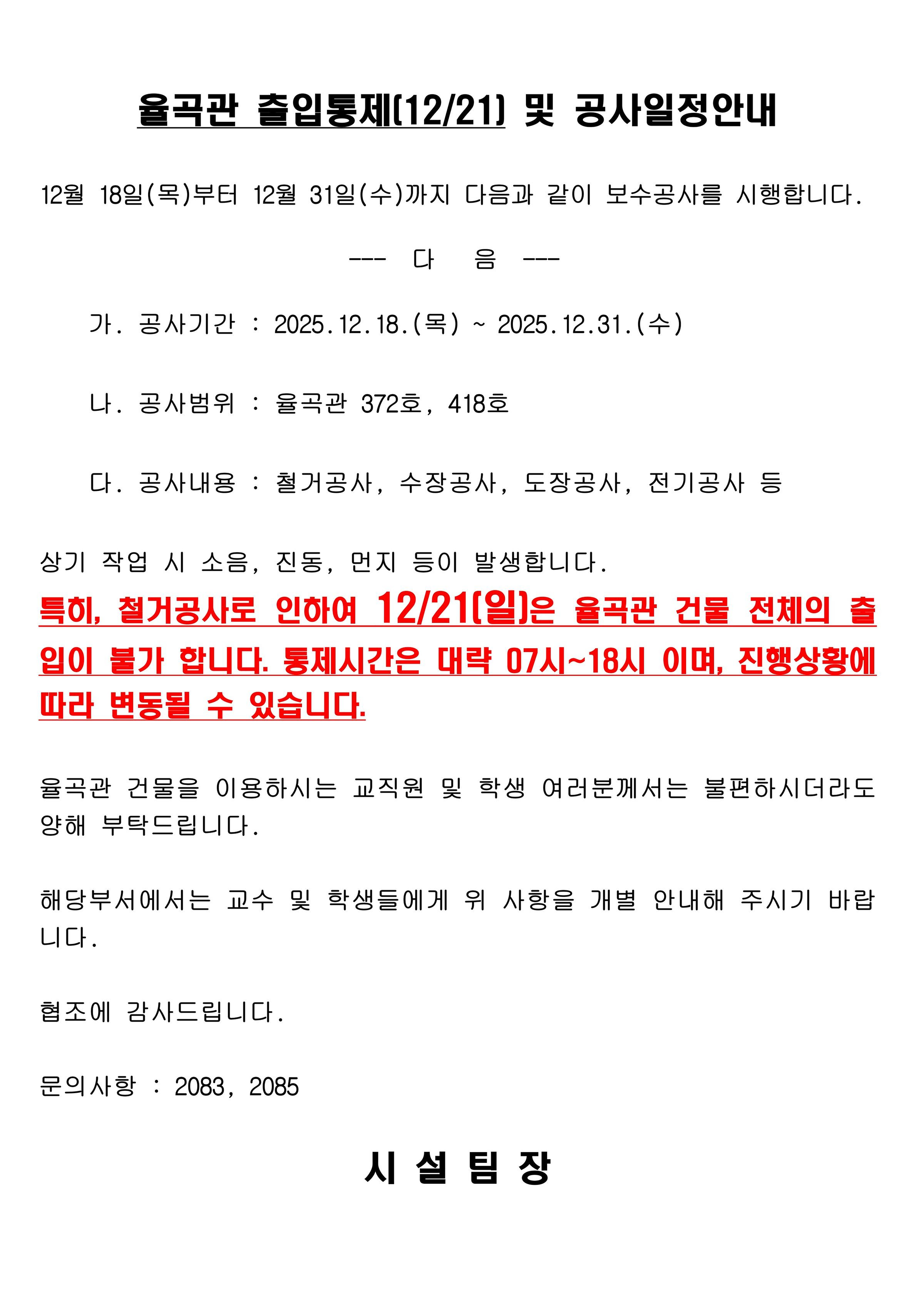 [시설팀] 율곡관 출입통제(12/21) 및 공사일정 안내
