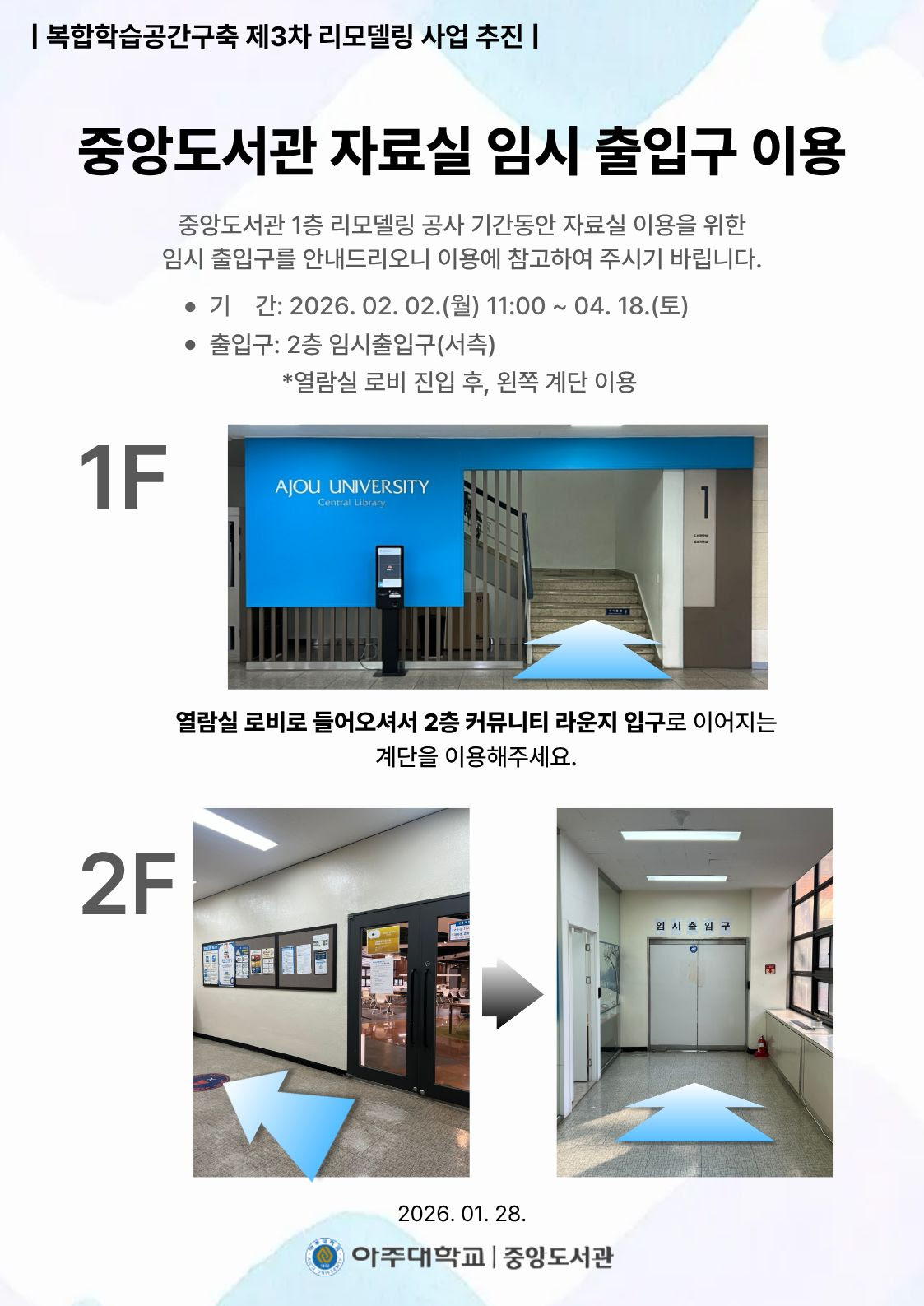 중앙도서관 자료실 임시 출입구 이용 안내 (2/2 11:00~)