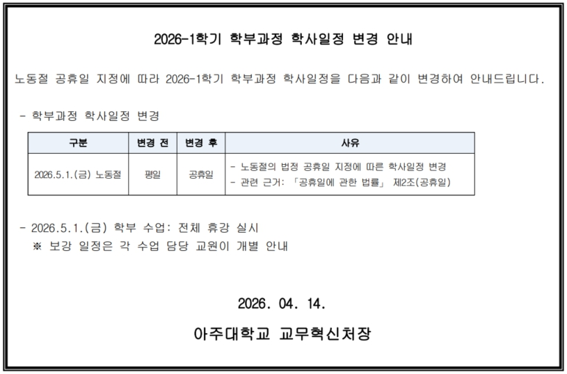 [교무팀] 노동절 공휴일 지정에 따른 2026-1학기 학부과정 학사일정 변경 안내