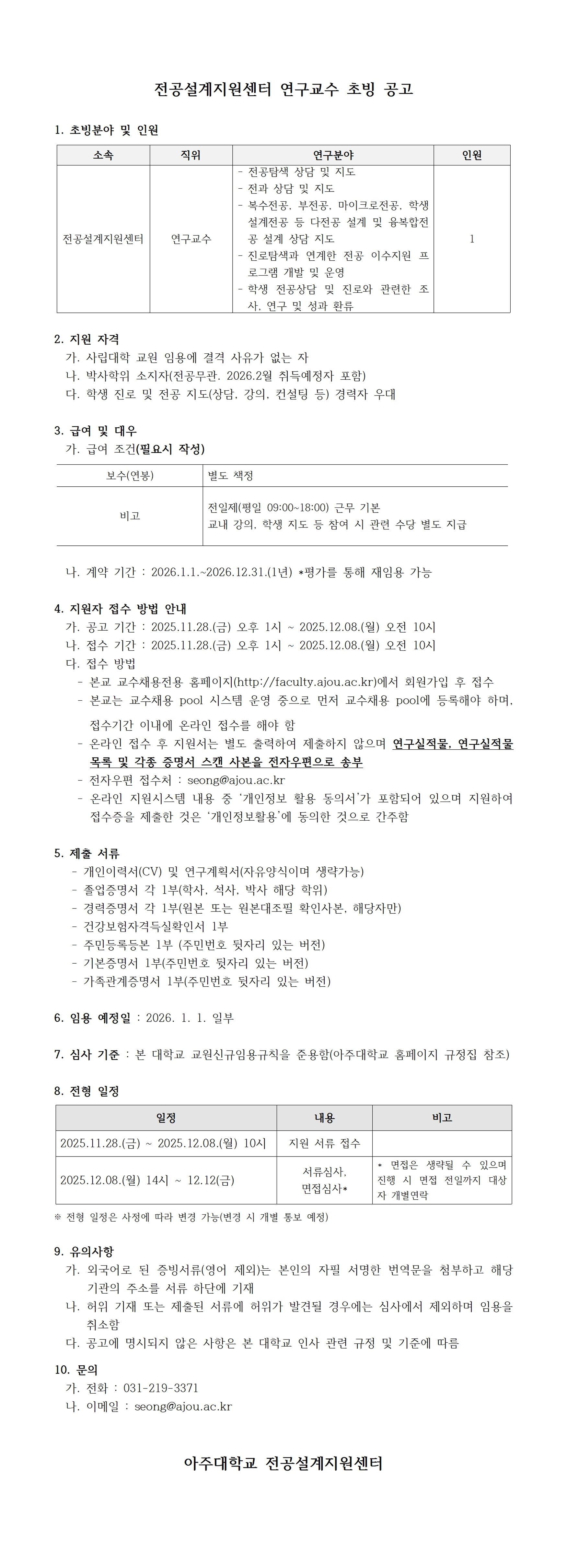 [공지] 2025학년도 2학기 아주대학교 전공설계지원센터 연구교수 초빙 공고 (2026.01.01일자)