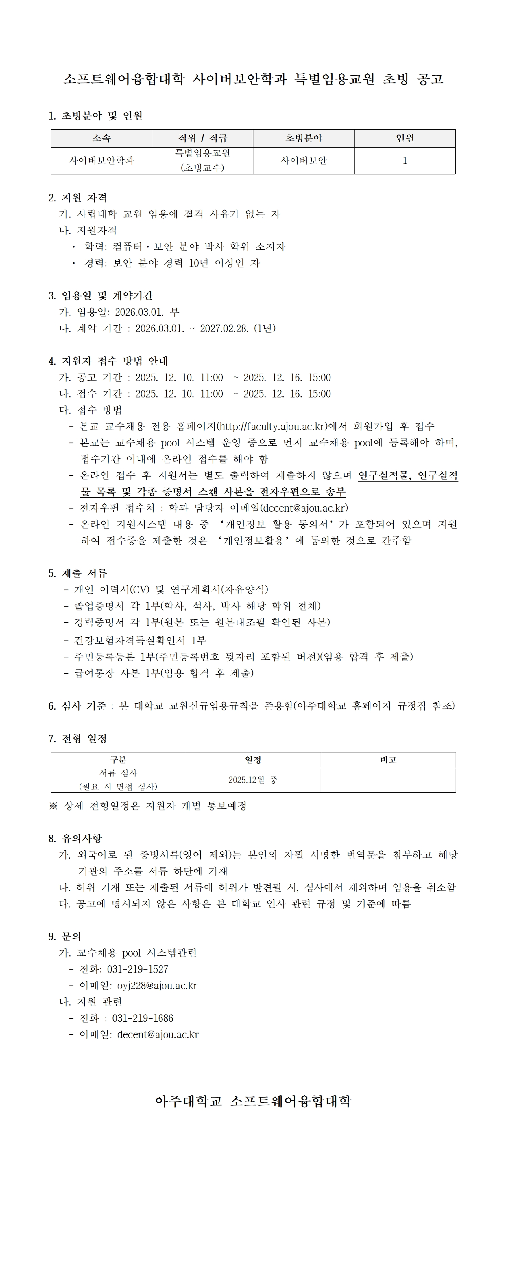 [공지] 2026학년도 1학기 아주대학교 소프트웨어융합대학 사이버보안학과 특별임용교원(초빙교수) 초빙 공고
