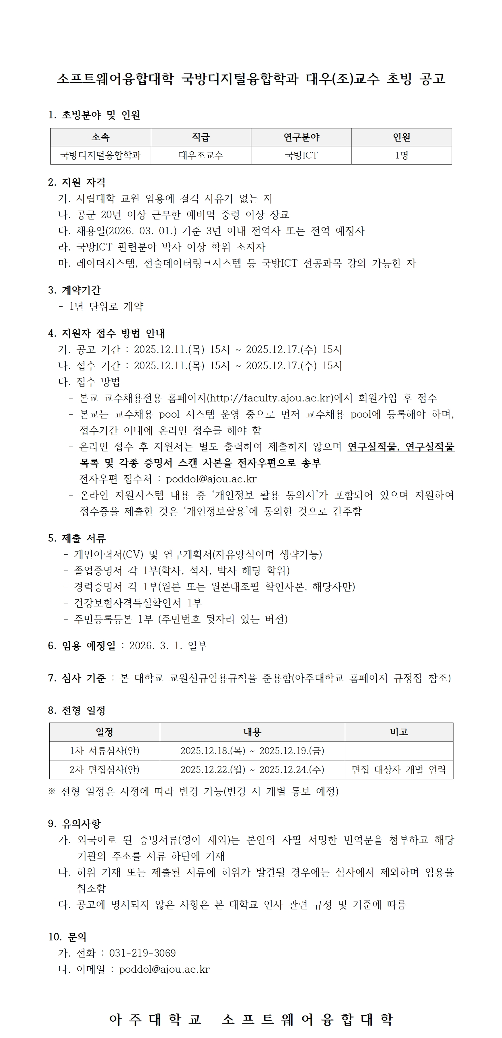 [공지] 2026학년도 1학기 아주대학교 소프트웨어융합대학 국방디지털융합학과 특별임용교원(대우조교수) 초빙 공고