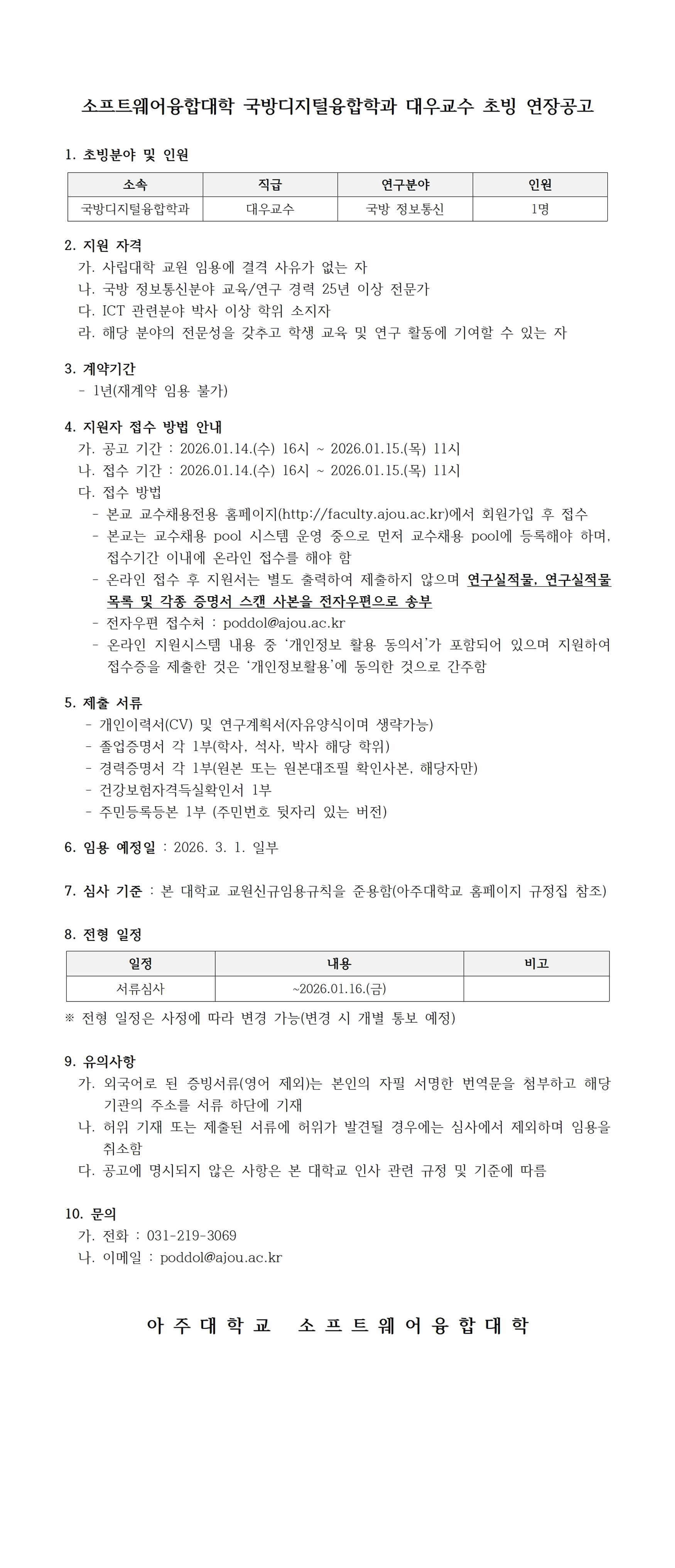 2026학년도 1학기 아주대학교 소프트웨어융합대학 국방디지털융합학과 대우교수 초빙 공고