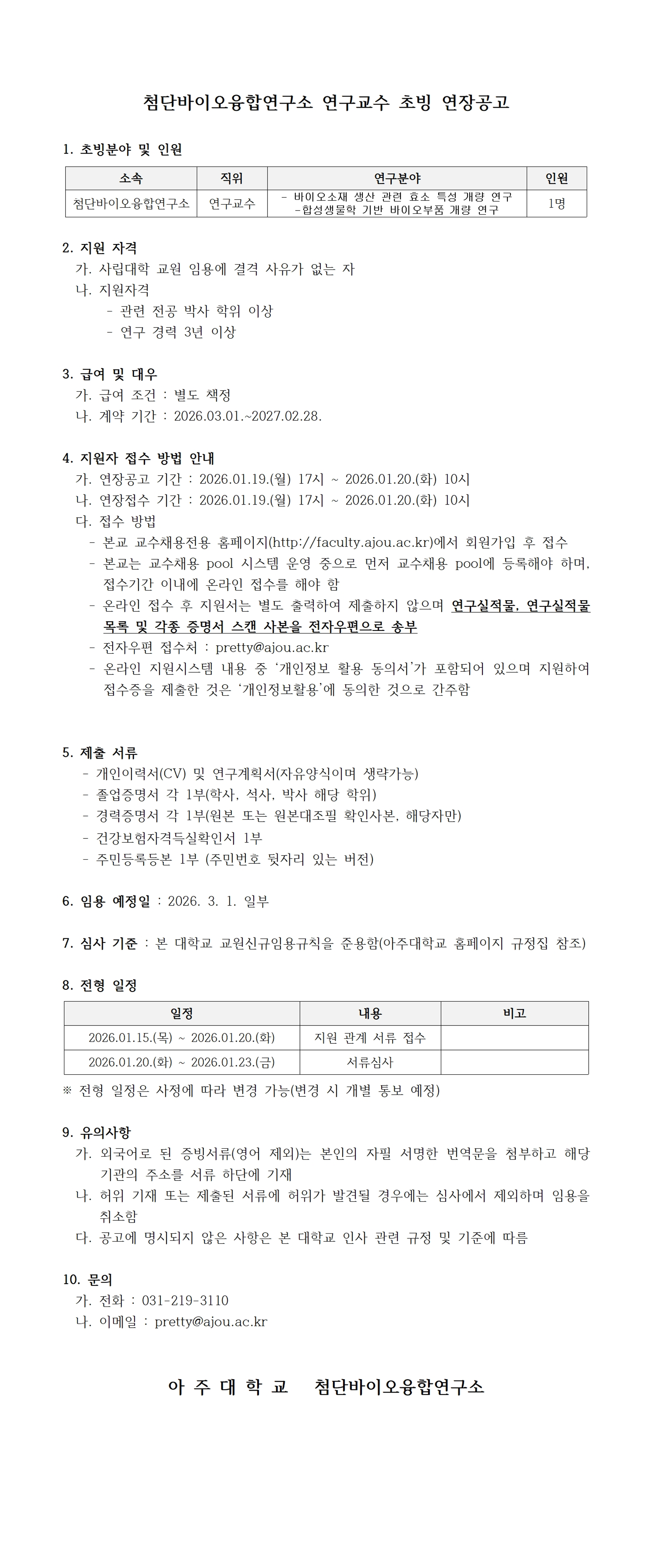 2026학년도 1학기 아주대학교 첨단바이오융합연구소 연구교수 초빙 공고
