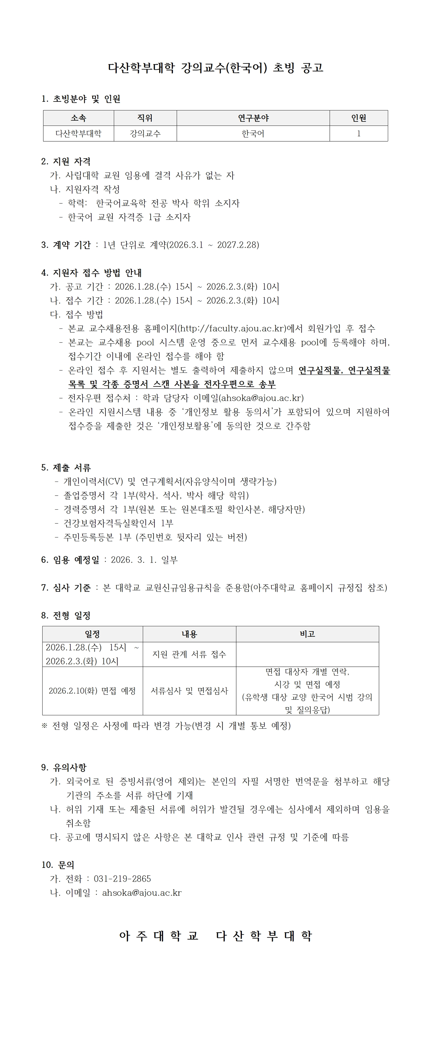 [공지] 2026학년도 1학기 아주대학교 다산학부대학 특별임용교원(강의교수-한국어) 초빙 공고