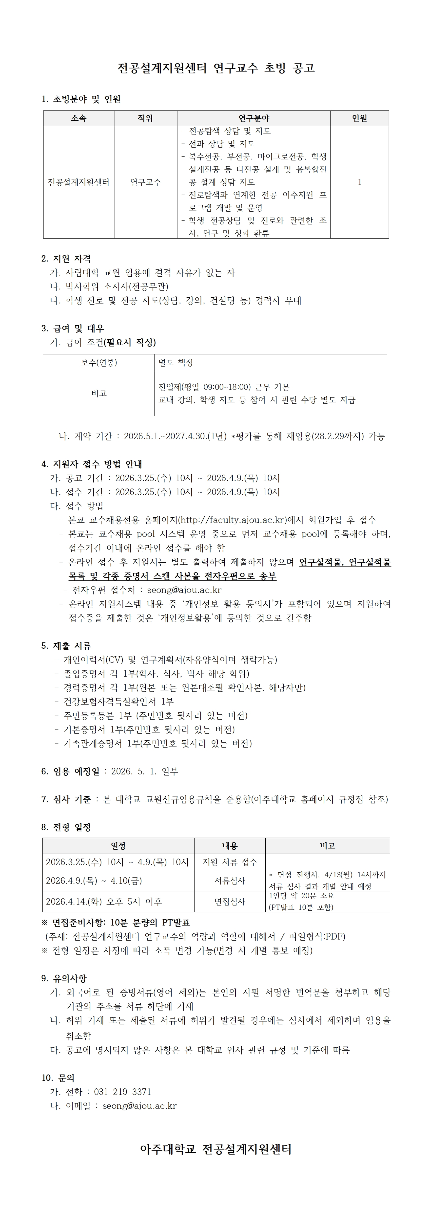 2026학년도 1학기 아주대학교 전공설계지원센터 연구교수 초빙 공고 (2026.05.01일자)