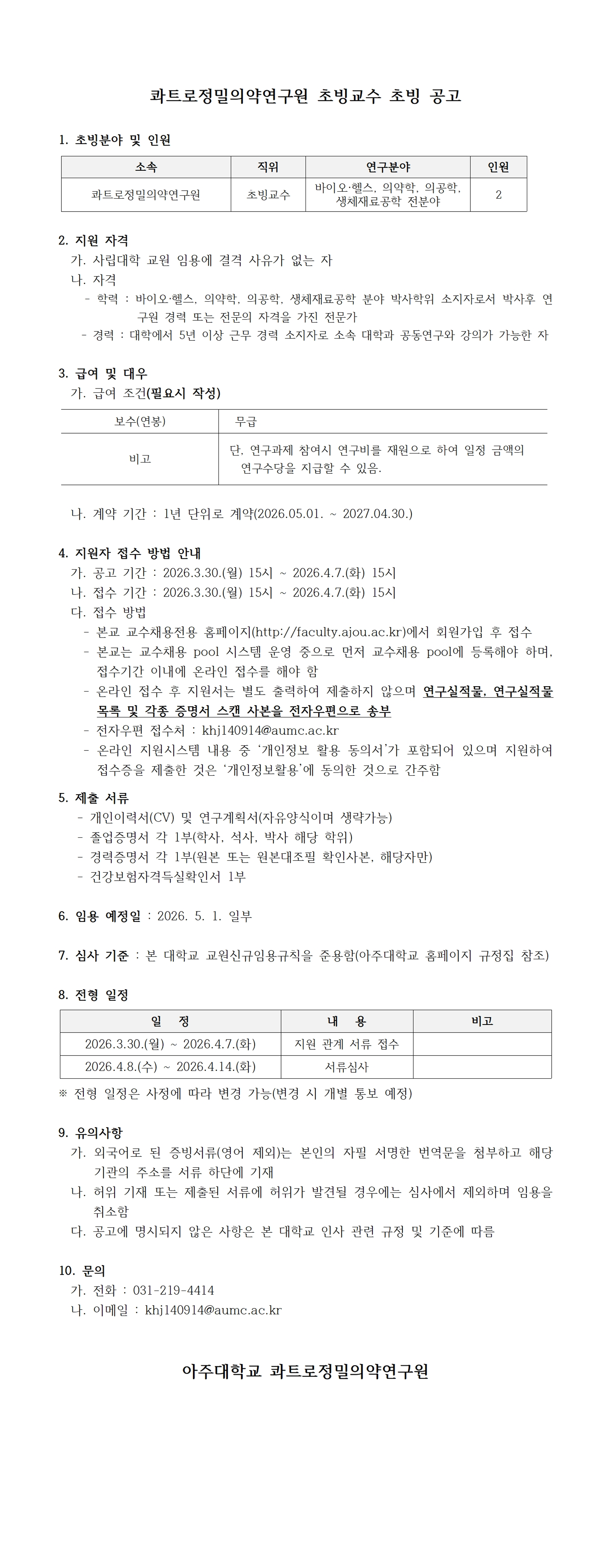2026학년도 1학기 아주대학교 콰트로정밀의약연구원 초빙교수 초빙 공고 (2026.05.01일자)