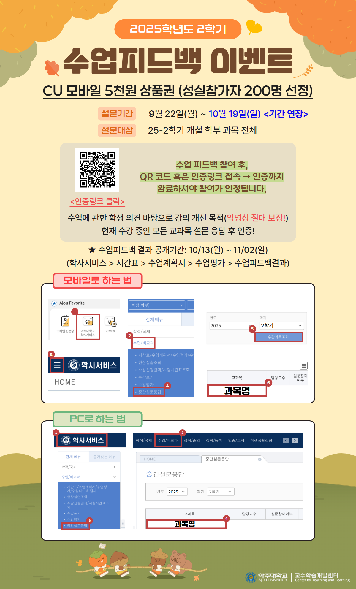 [공지] (*기간연장)[학부] 2025학년도 2학기 수업피드백 실시 안내(09.22.(월)~10.19.(일))