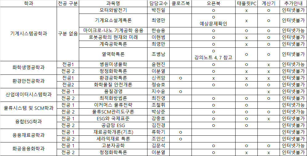 - 공학용 계산기가 필요한 과목은 반드시 개별 준비필요