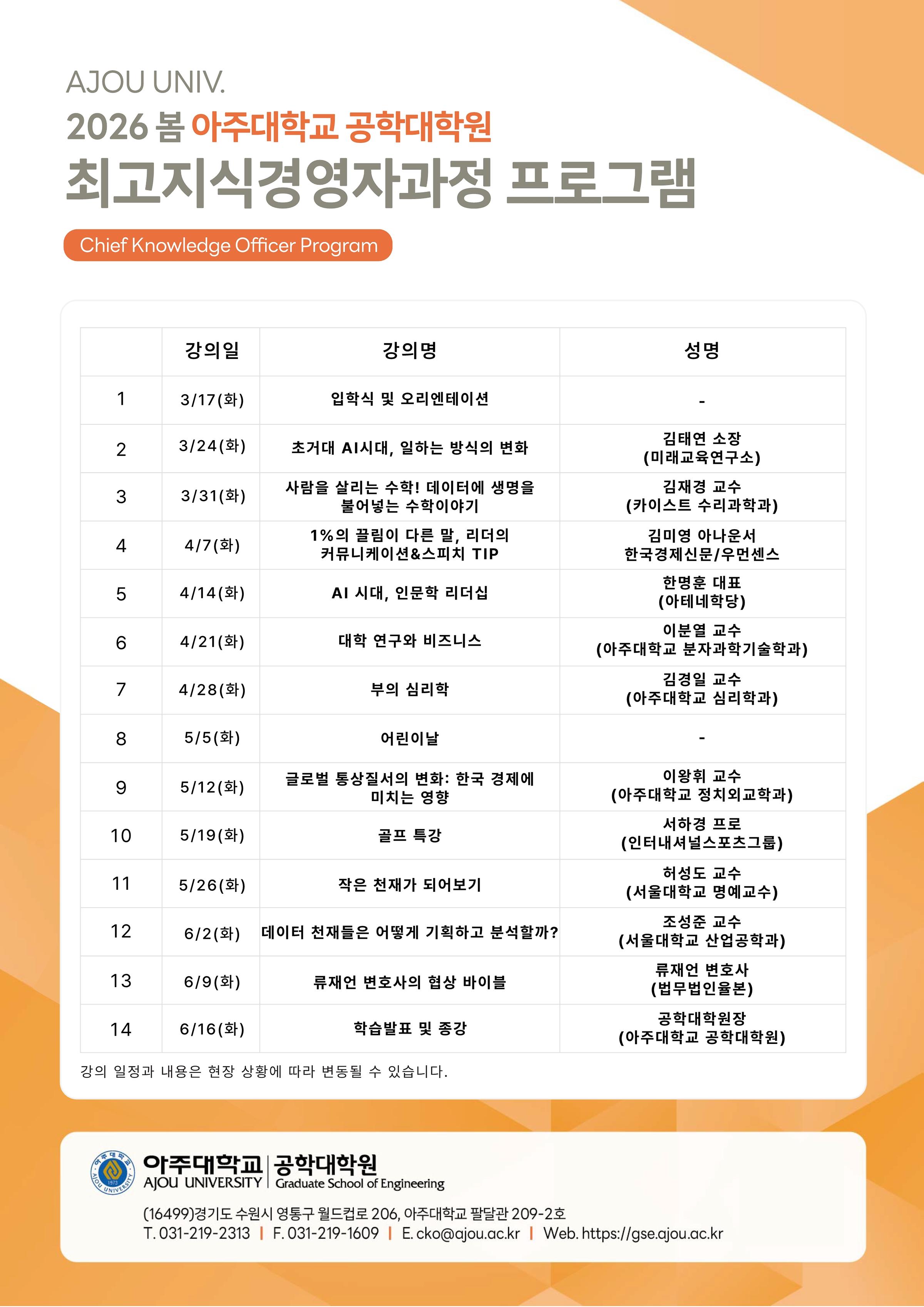 ※입학문의: 공학대학원 최고위과정 담당 최로희(031-219-2313, cko@ajou.ac.kr)
