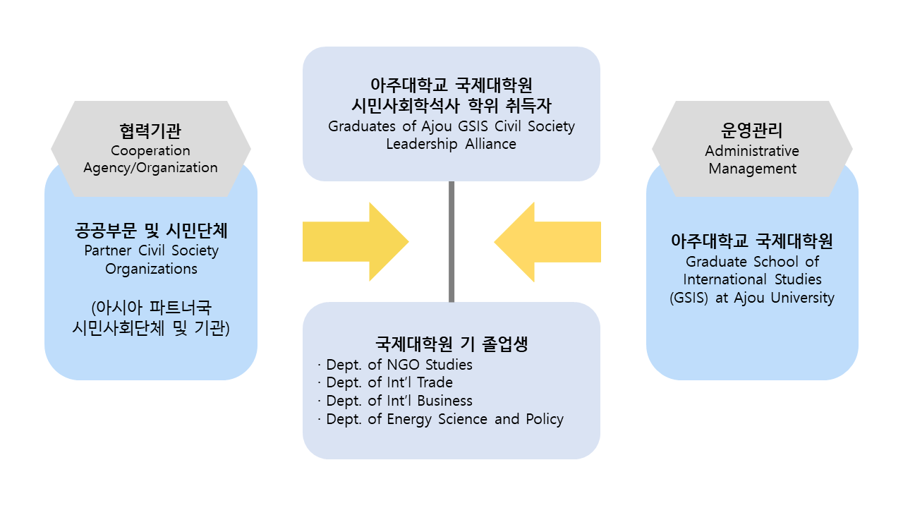 아주대학교 국제대학원 ‘아시아 시민사회리더십’ 석사 학위 취득자 및 아시아 파트너국 시민사회단체 및 기관, 국제대학원 기 졸업생 등 선진국-파트너국, 파트너국-파트너국간 공공부문, 기업, 시민사회단체의 다양한 경험과 정보를 교류할 수 있는 모임