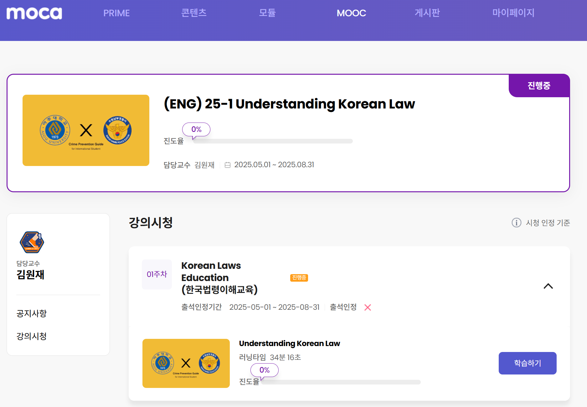 Ajou University Portal → MOCA → MOOCs → Log in → Pending Courses → Search ‘25-2 Understanding Korean Laws Education’ → Watch lecture