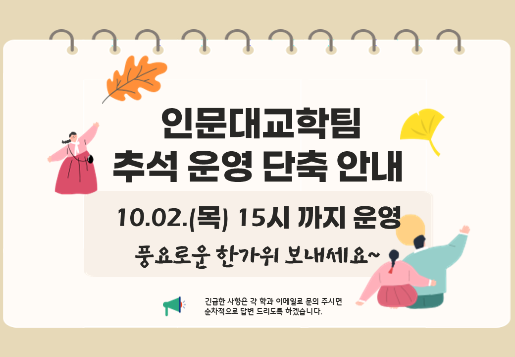 [공지] ⭐추석 연휴 전일 인문대학교학팀 단축근무 안내(10/02(목))
