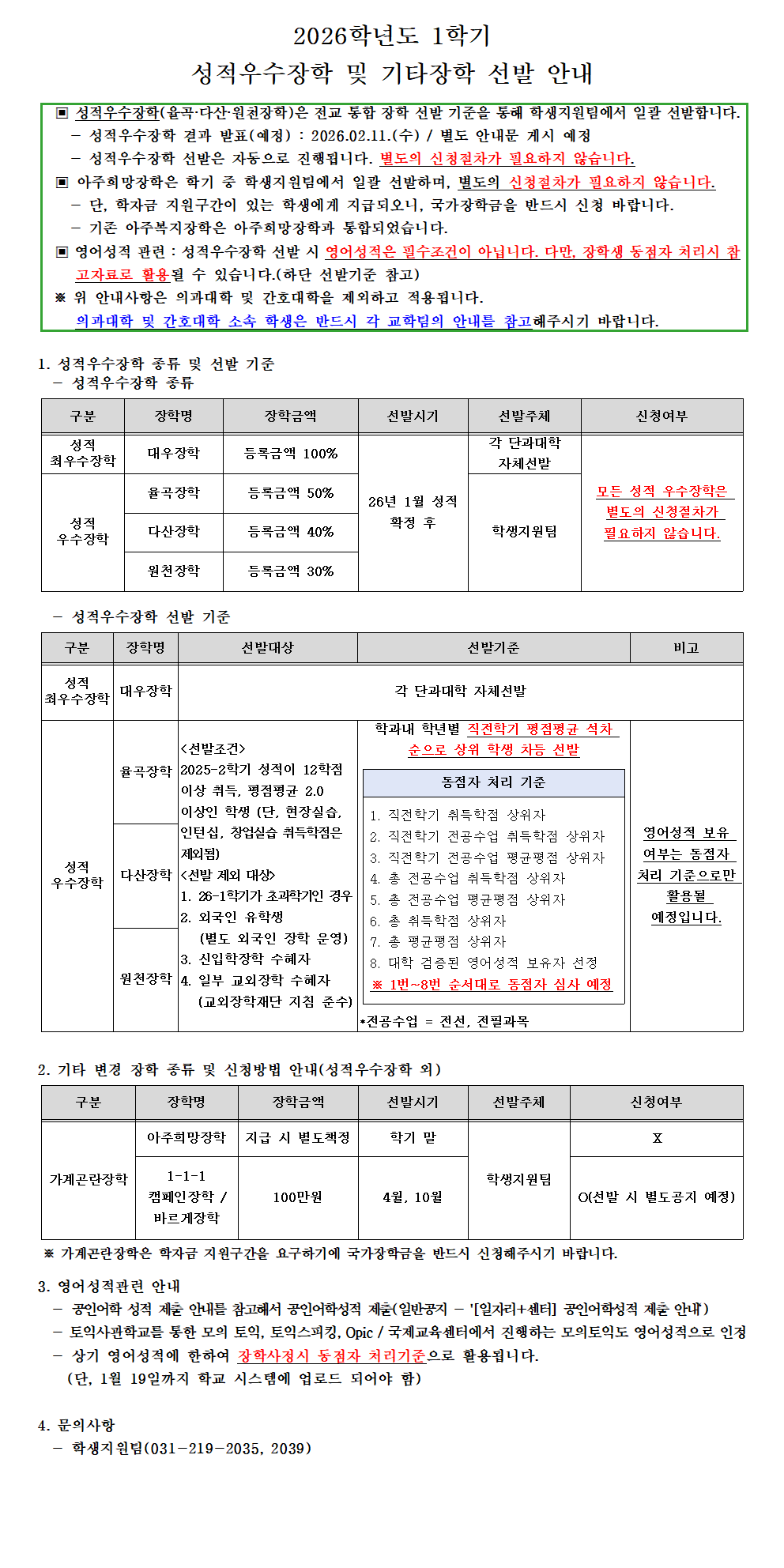 [장학] 2026학년도 1학기 성적우수장학 및 기타장학 선발 안내