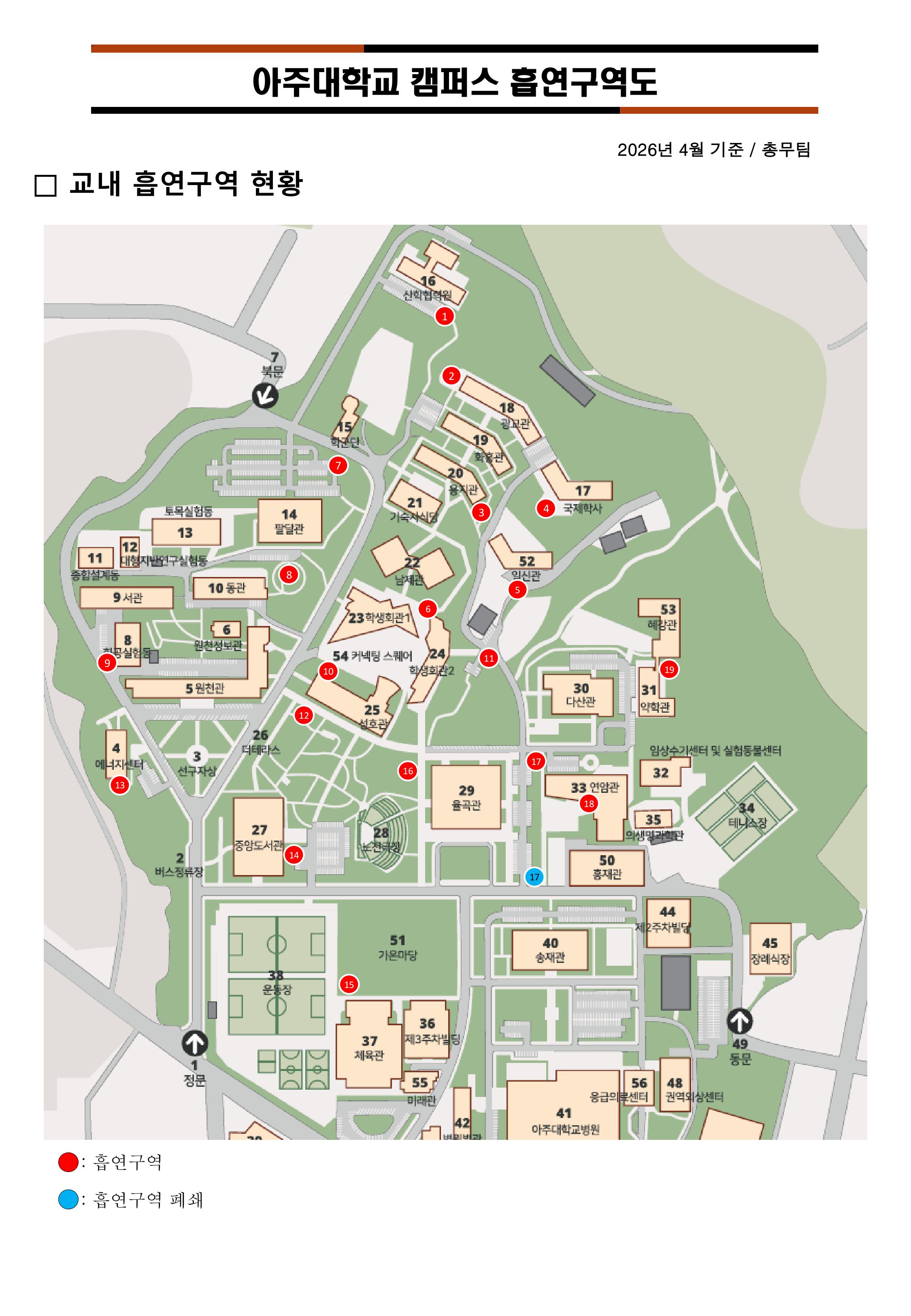 현재 ( 2026.04. 기준) 교내 지정된 흡연구역을 안내 드립니다.