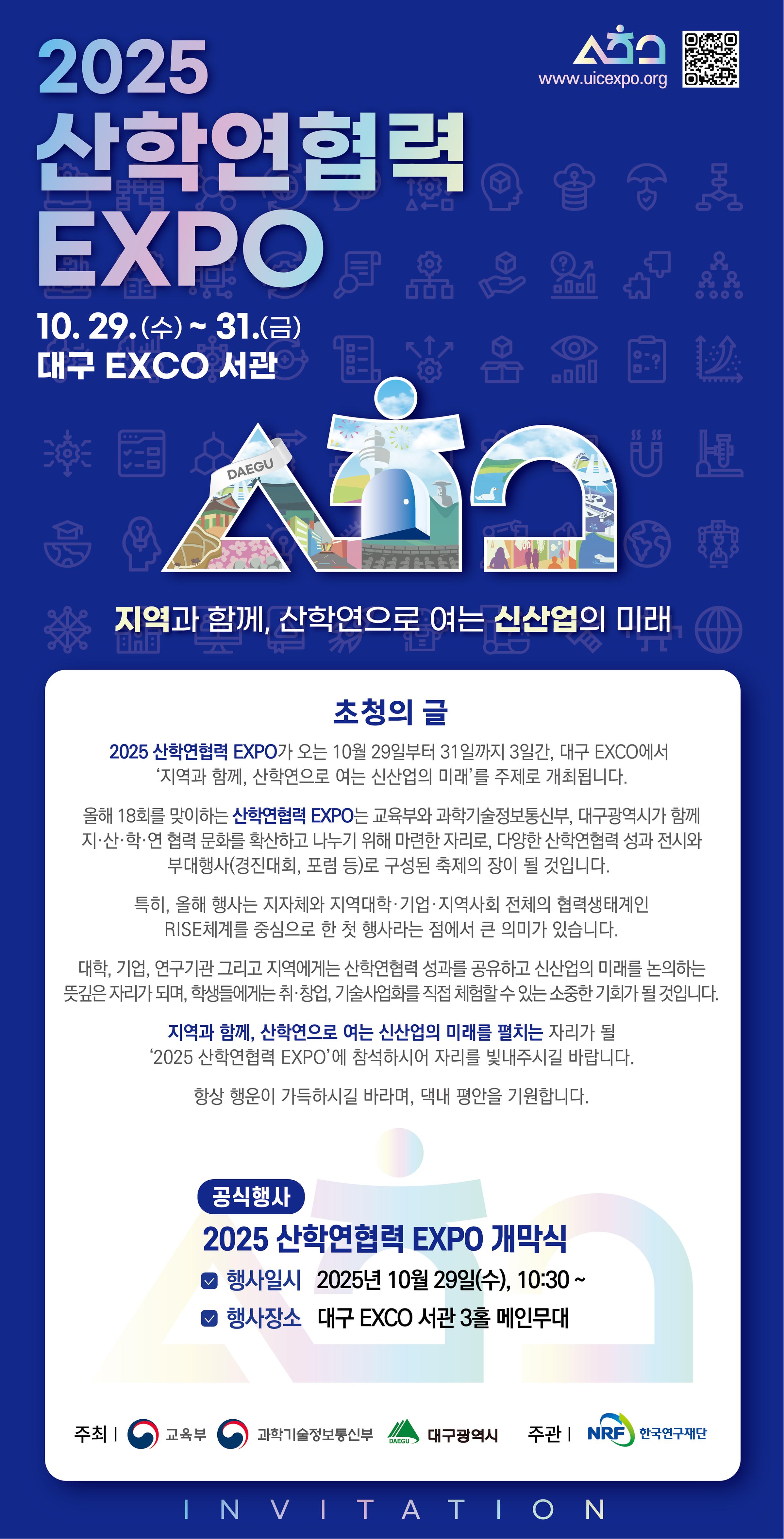 교육부·과학기술정보통신부·대구광역시가 공동 주최하고 한국연구재단이 주관하는 2025 산학연협력 EXPO가 "지역과 함께, 산학연으로 여는 신산업의 미래"를 주제로 아래와 같이 개최되오니, 많은 관심과 참여 부탁드립니다.