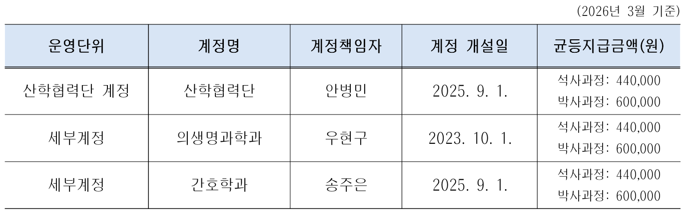2026학년도 1학기 학생인건비 통합관리 연구개발기관계정의 균등지급금액 정보를 공개합니다.