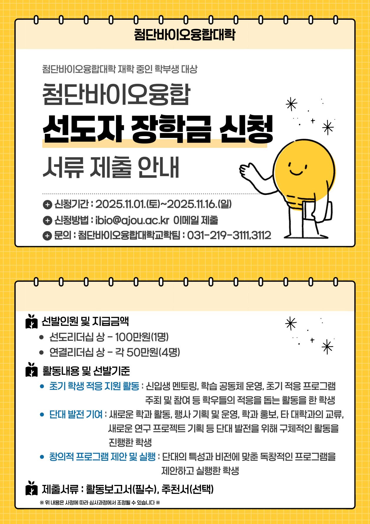 첨단바이오융합 선도자 장학금 신청기간 및 서류 제출 안내