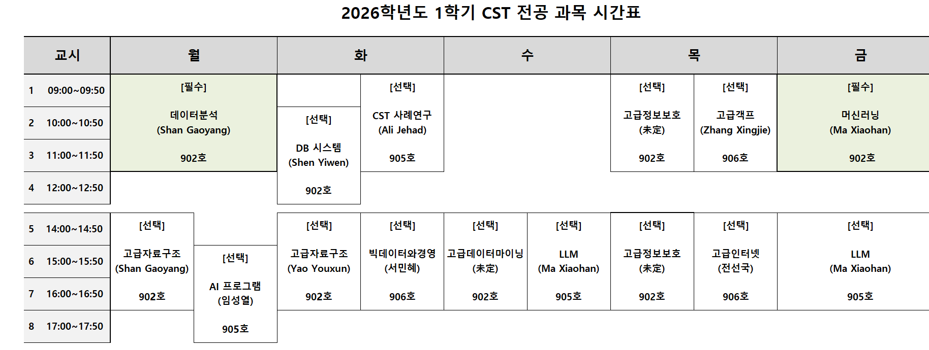 - 과목별 시간표는 첨부된 '2026-1학기 CST 전공 과목 시간표'를 확인하여 주시기 바랍니다.