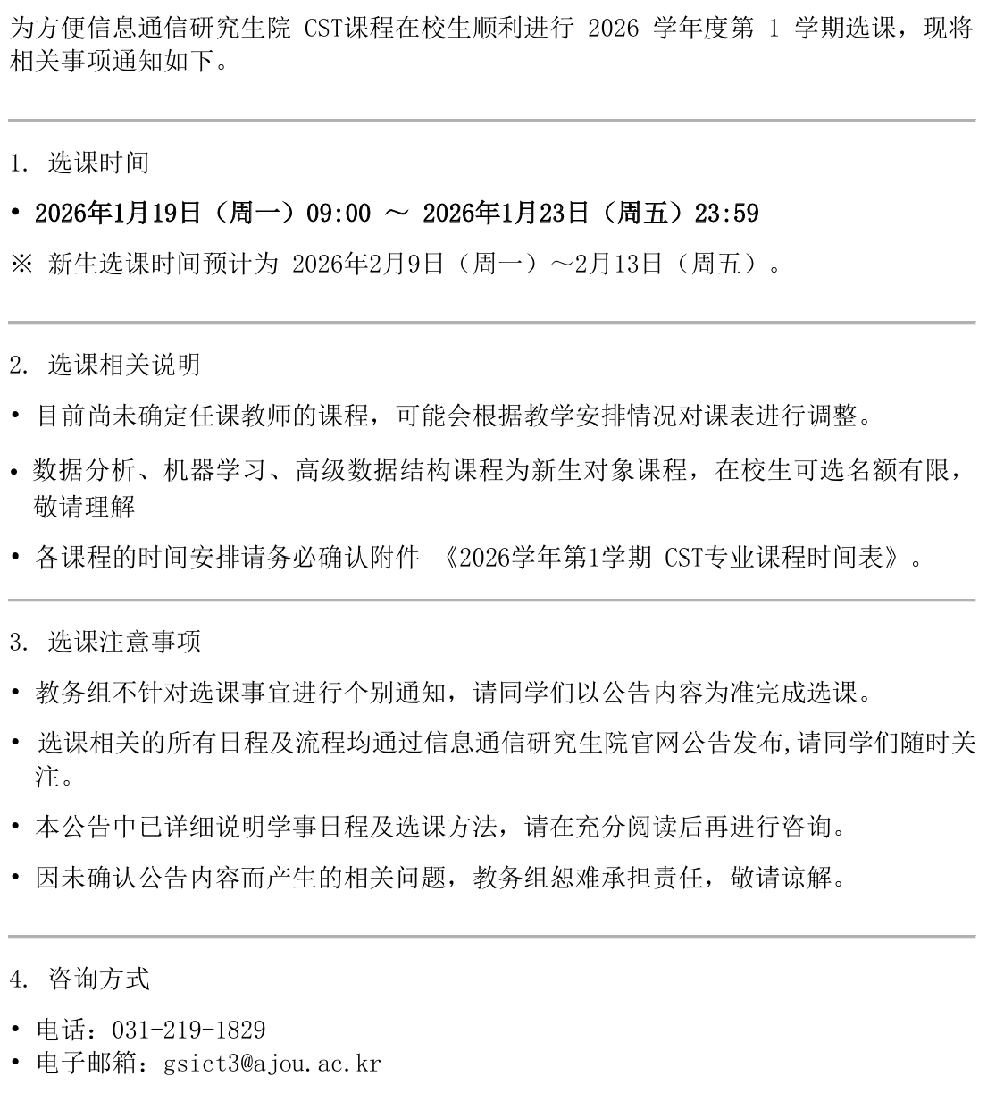 - 수강신청과 관련된 모든 일정 및 절차는 정보통신대학원 홈페이지 공지사항을 통해 안내드리고 있으므로, 수시로 확인하여 주시기 바랍니다.