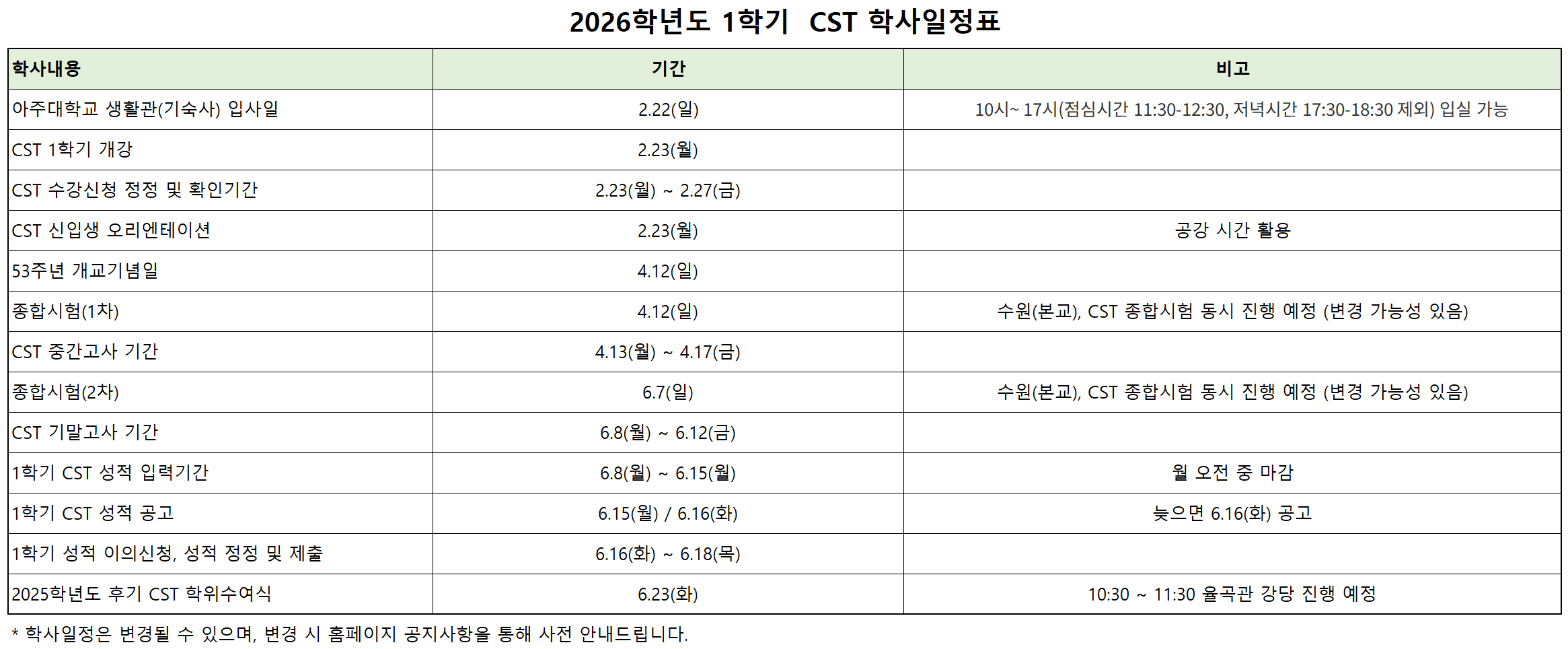 2026학년도 1학기 CST 학사 일정표를 안내드립니다.