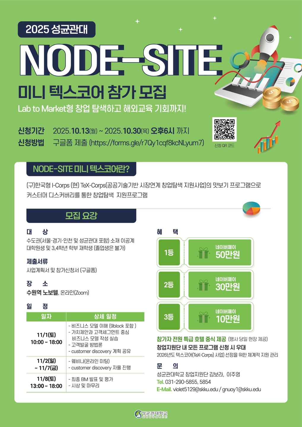 글로벌 무대로 도전하고 싶은 창업팀과 연구자들을 위해, 「2025 성균관대 NODE-SITE 미니 텍스코어」 참가자를 모집합니다.
