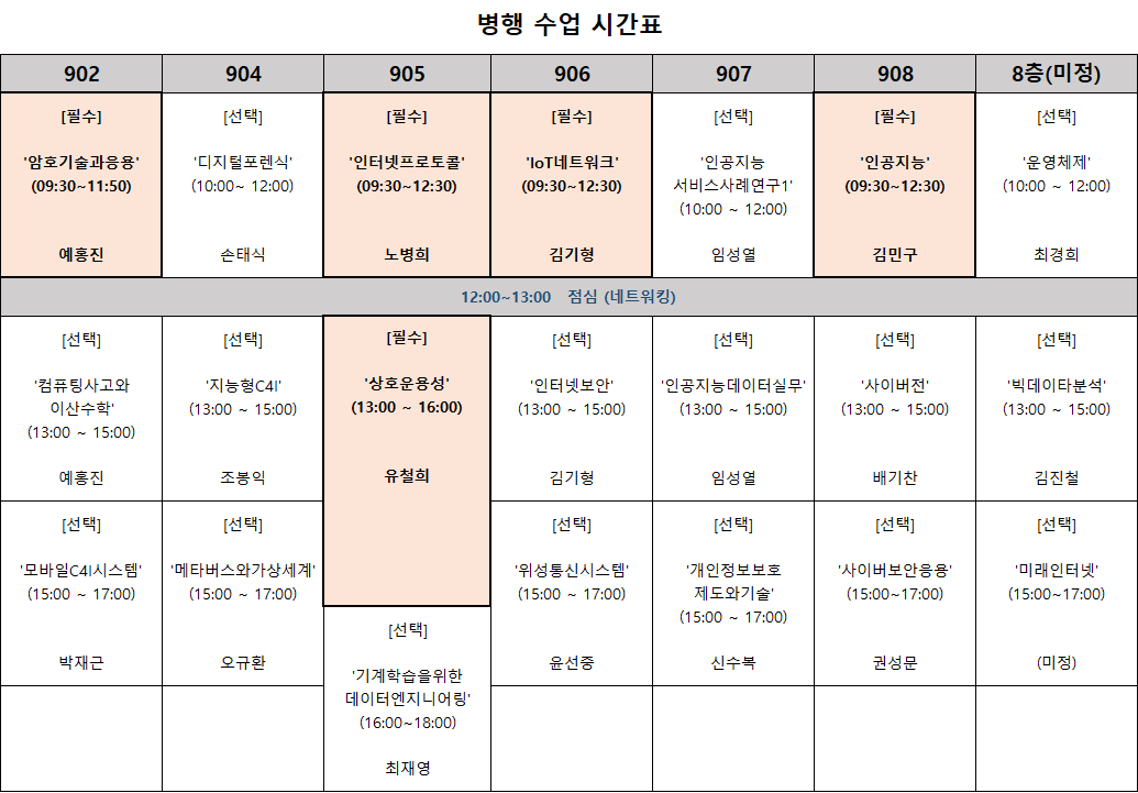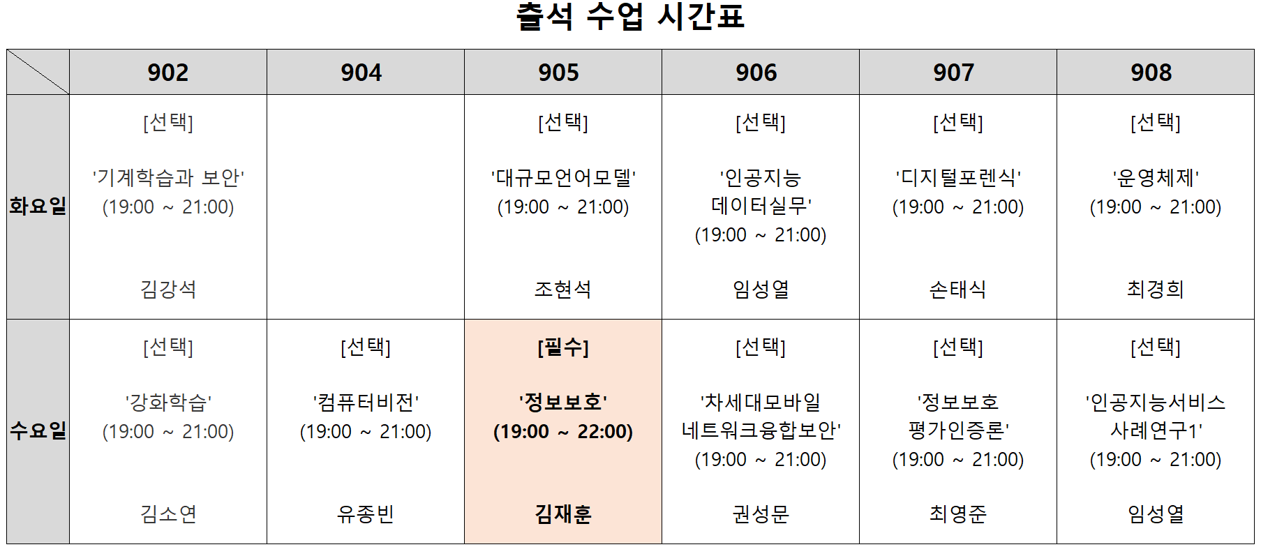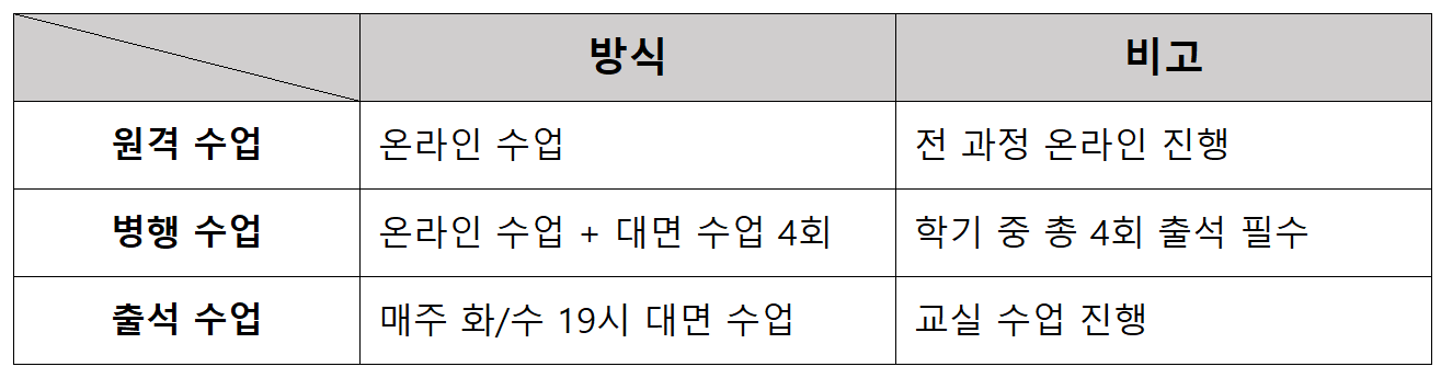 (요일/시간으로 구분 가능->출석: 화 or수 저녁 / 병행: 토 / 원격: 온라인 )
