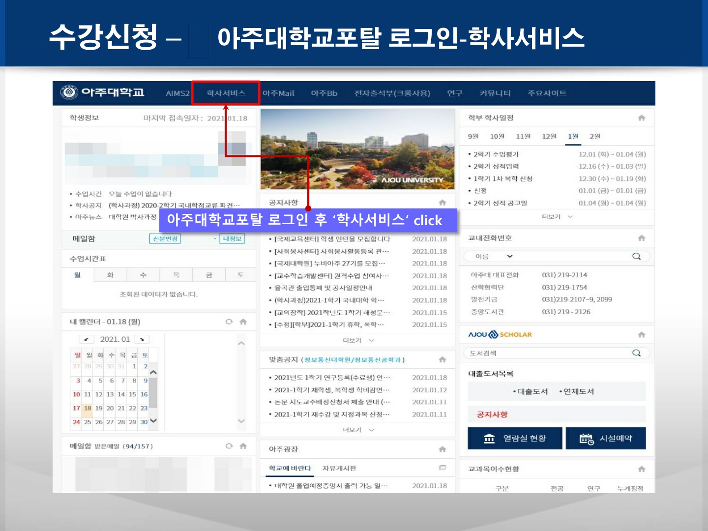수강신청 방법 안내절차에 따라 진행 (portal.ajou.ac.kr->학사서비스->교과수업->수강신청)