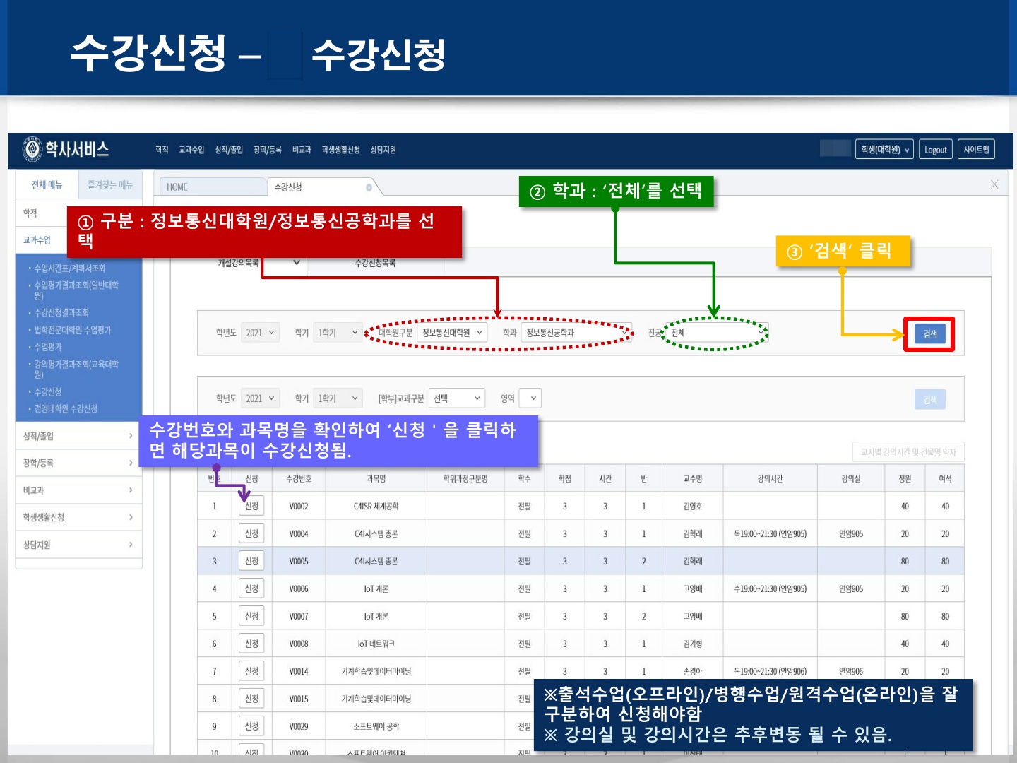 3. 수강정정 기간 중 본인 지도 교수님 분반으로 정정