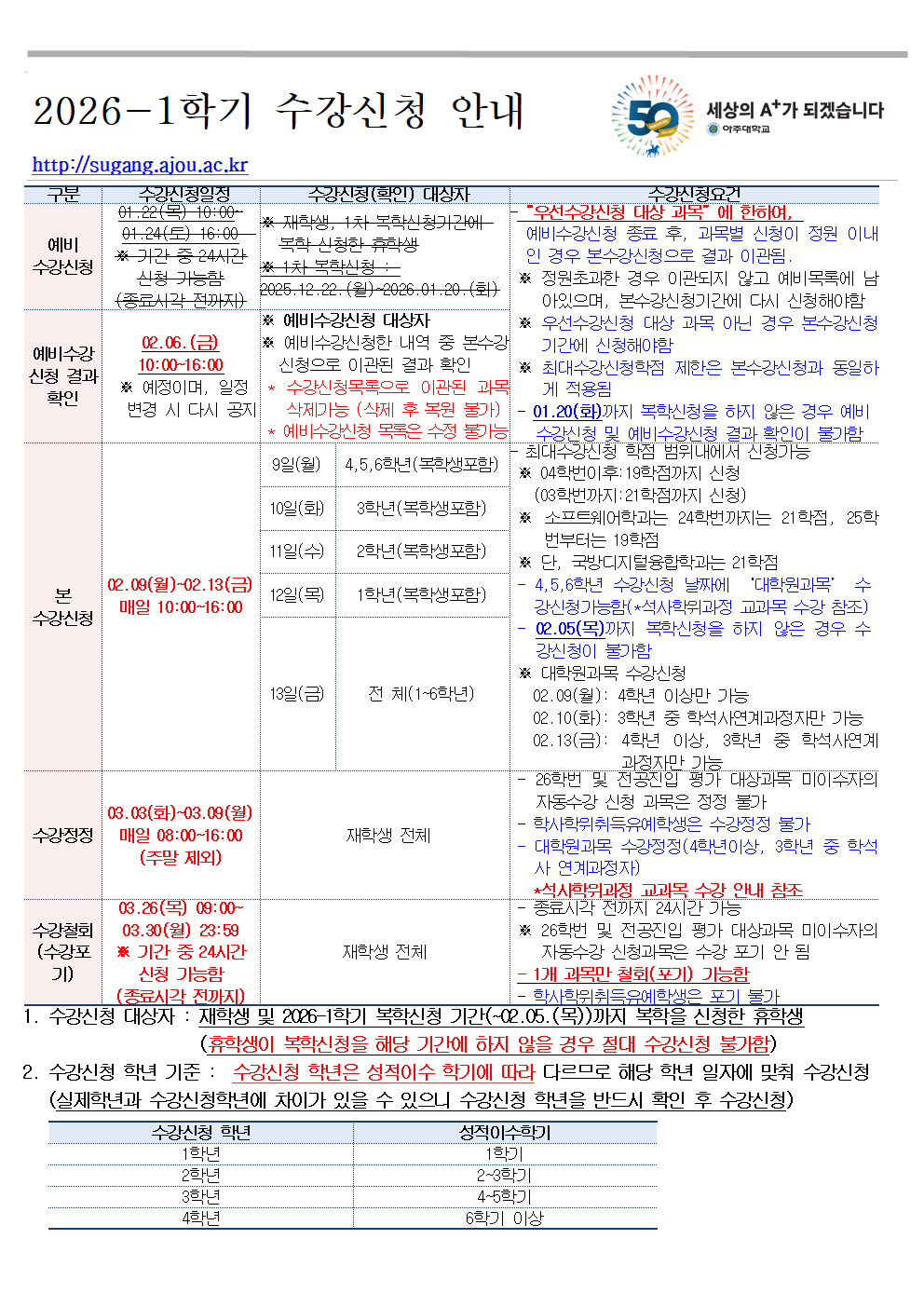 1. 2026학년도 1학기 수강신청 시 유의사항(수시 업데이트)