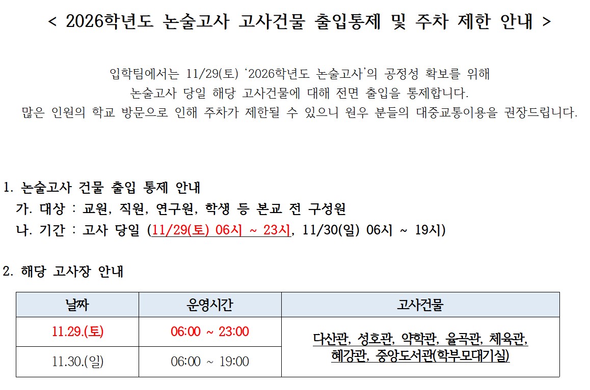[기타] 2026학년도 논술고사 고사건물 출입통제 및 본교 주차 제한 안내