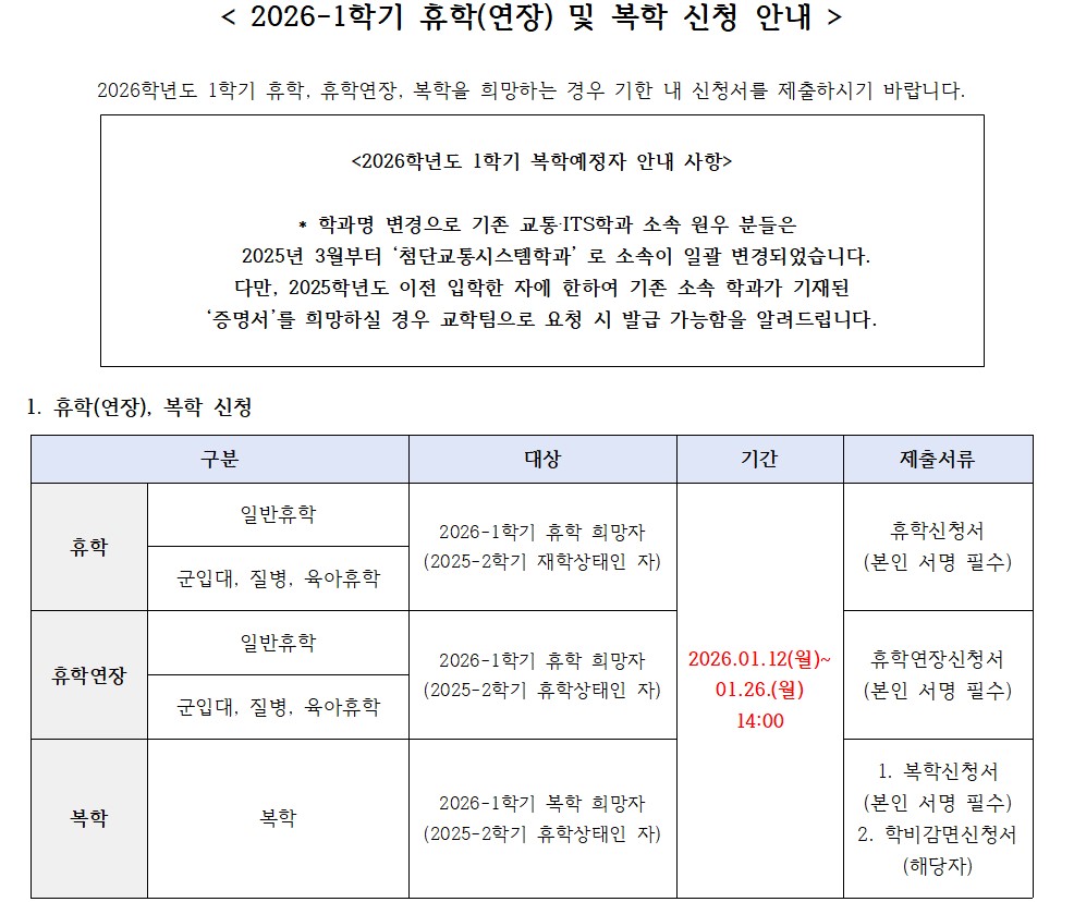 [학사] 2026-1학기 휴학(연장) 및 복학 신청 안내