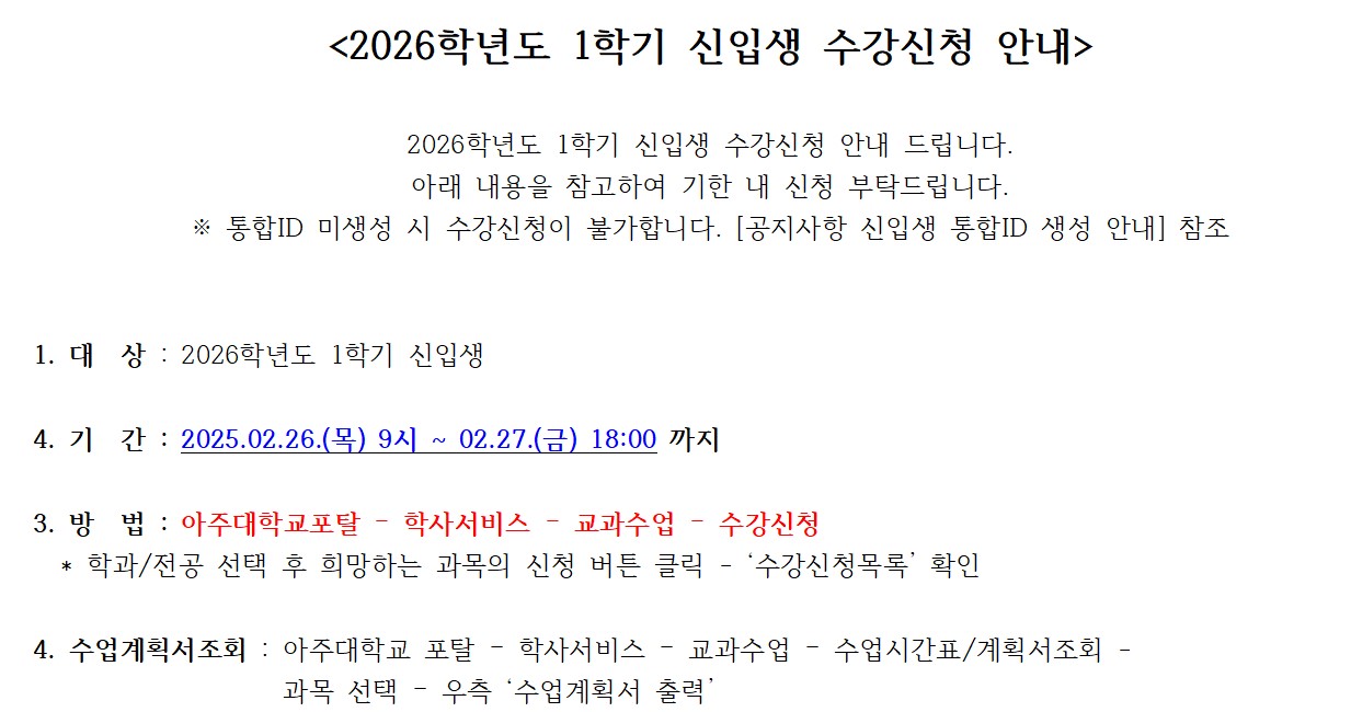 [학사] 2026학년도 1학기 신입생 수강신청 안내