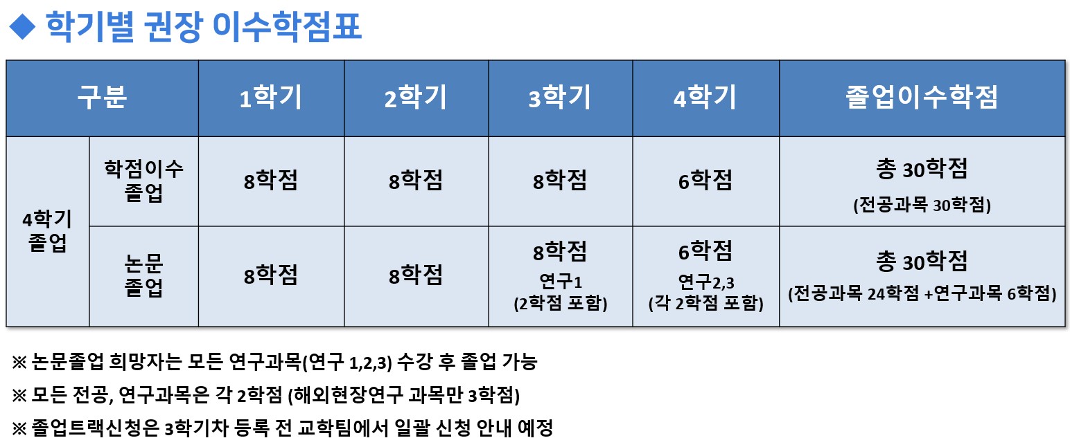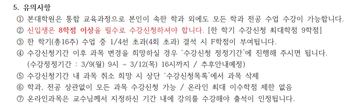 ※ 신입생 분들은 총 4과목의 교과목을 수강신청 하시되,