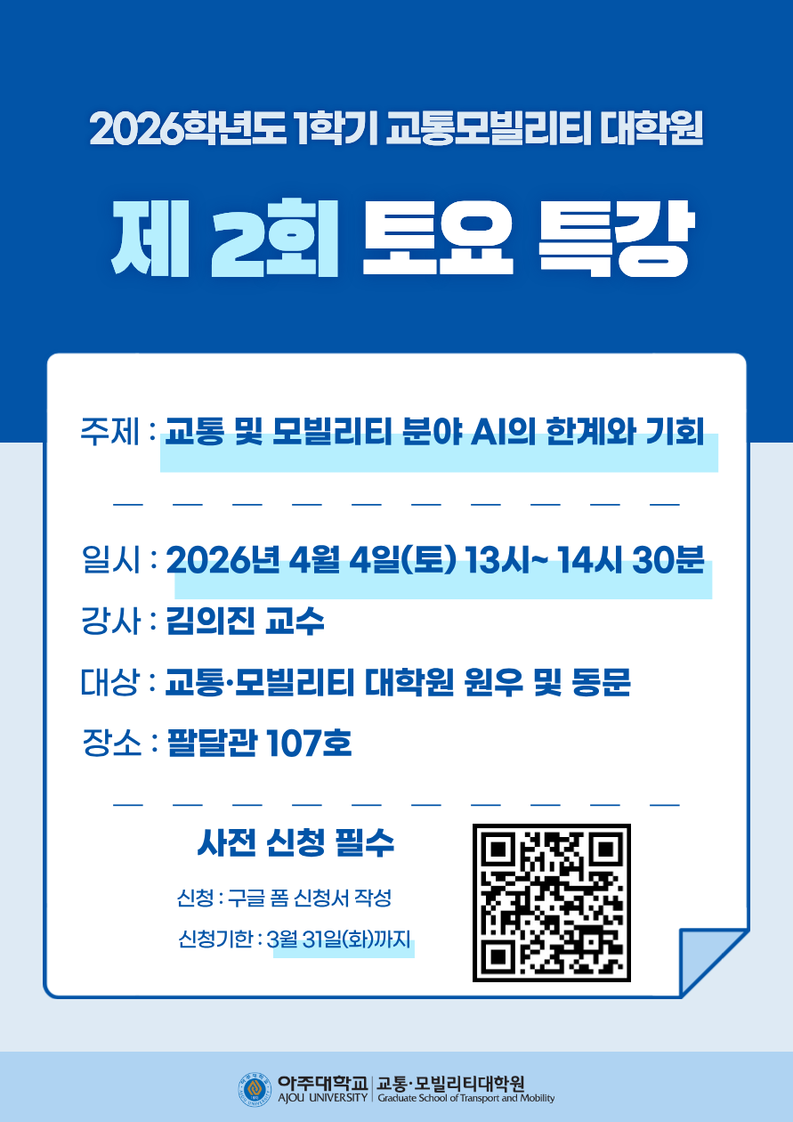 『교통 및 모빌리티 분야 AI의 한계와 기회』 특강이 진행될 예정입니다.